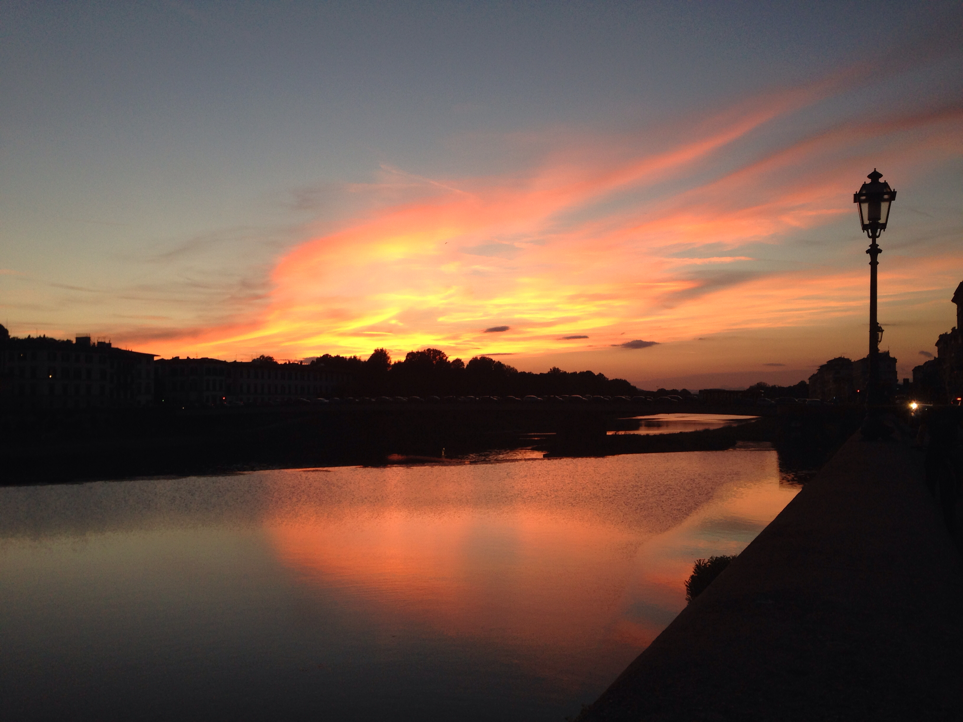 Min första dag i Florens strosar jag längs med Arno i skymningen och ser solen går ner bakom kullarna och den blommande bougainvillean på andra sidan vattnet. Fullmånen stiger upp i dess ställe på den bleka himlen och även om det är kyligare i september, min väninna Carolina som är tvättäkta florentinska huttrar i vinden trots vinterjacka, är den 18-gradiga kvällen knappast kall.