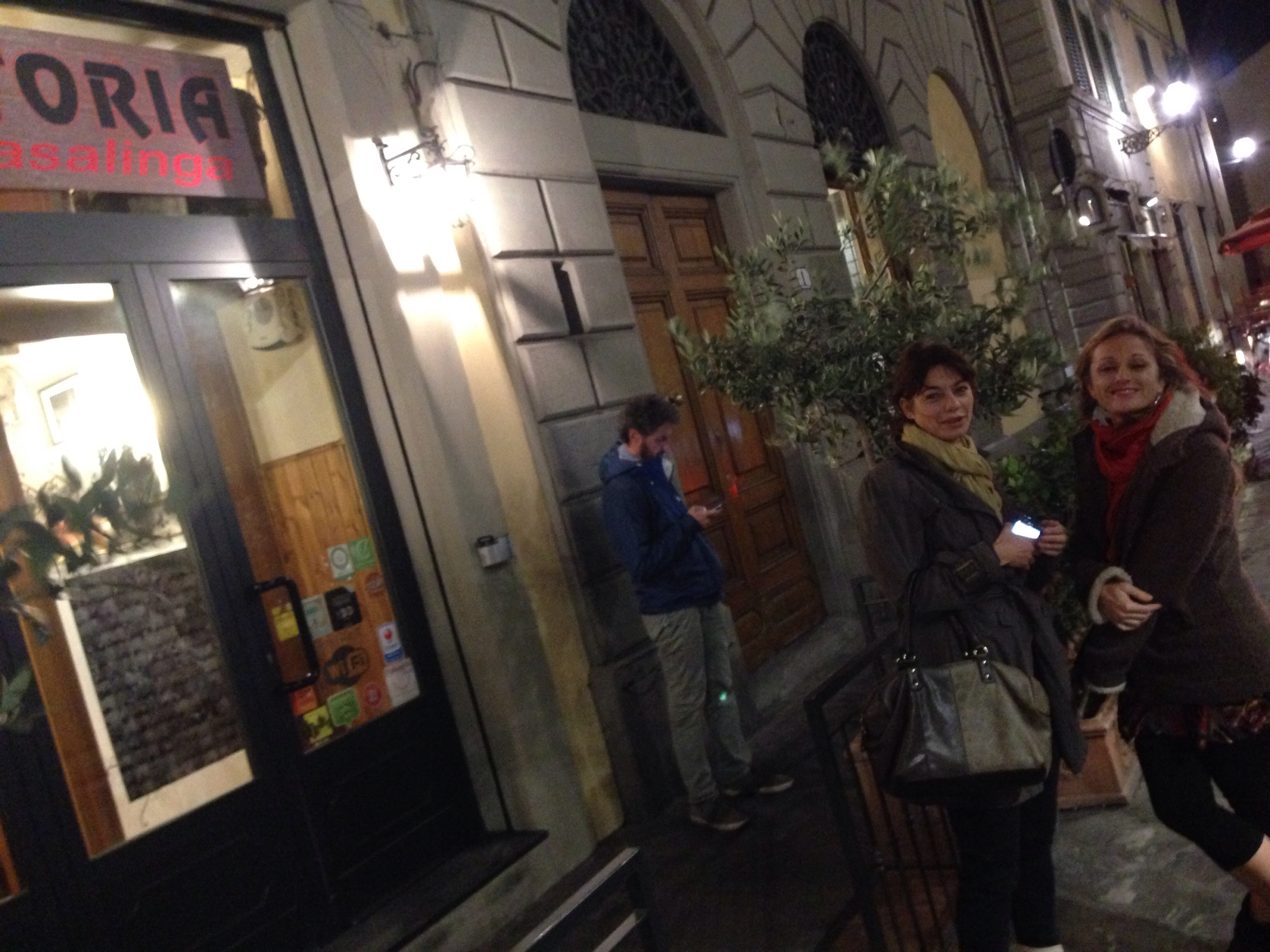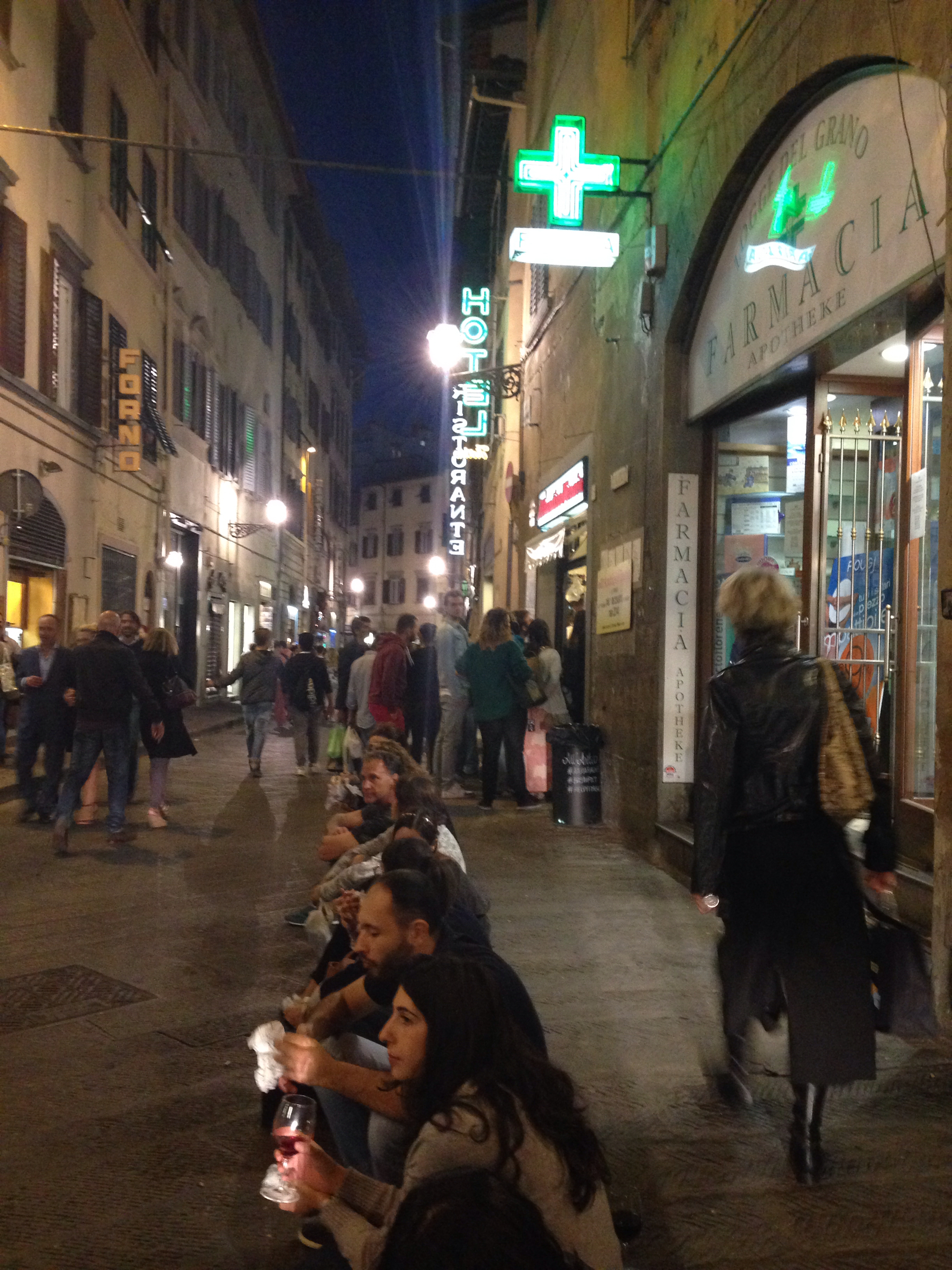 Överallt på gatorna trängs människor – turister och infödingar. Om kvällarna när mörkret fallit fylls uteserveringarna av florentinare som dricker vin, intar sin aperitivo (ett smörgåsbord i miniatyr med pasta- och grönsaksrätter, salami, proscuttio, ostar, bröd och risotto och allt är gratis när du köper ett glas) och småpratar med vänner. Ett perfekt sätt att äta sig mätt för en billig peng. IMG_0494
