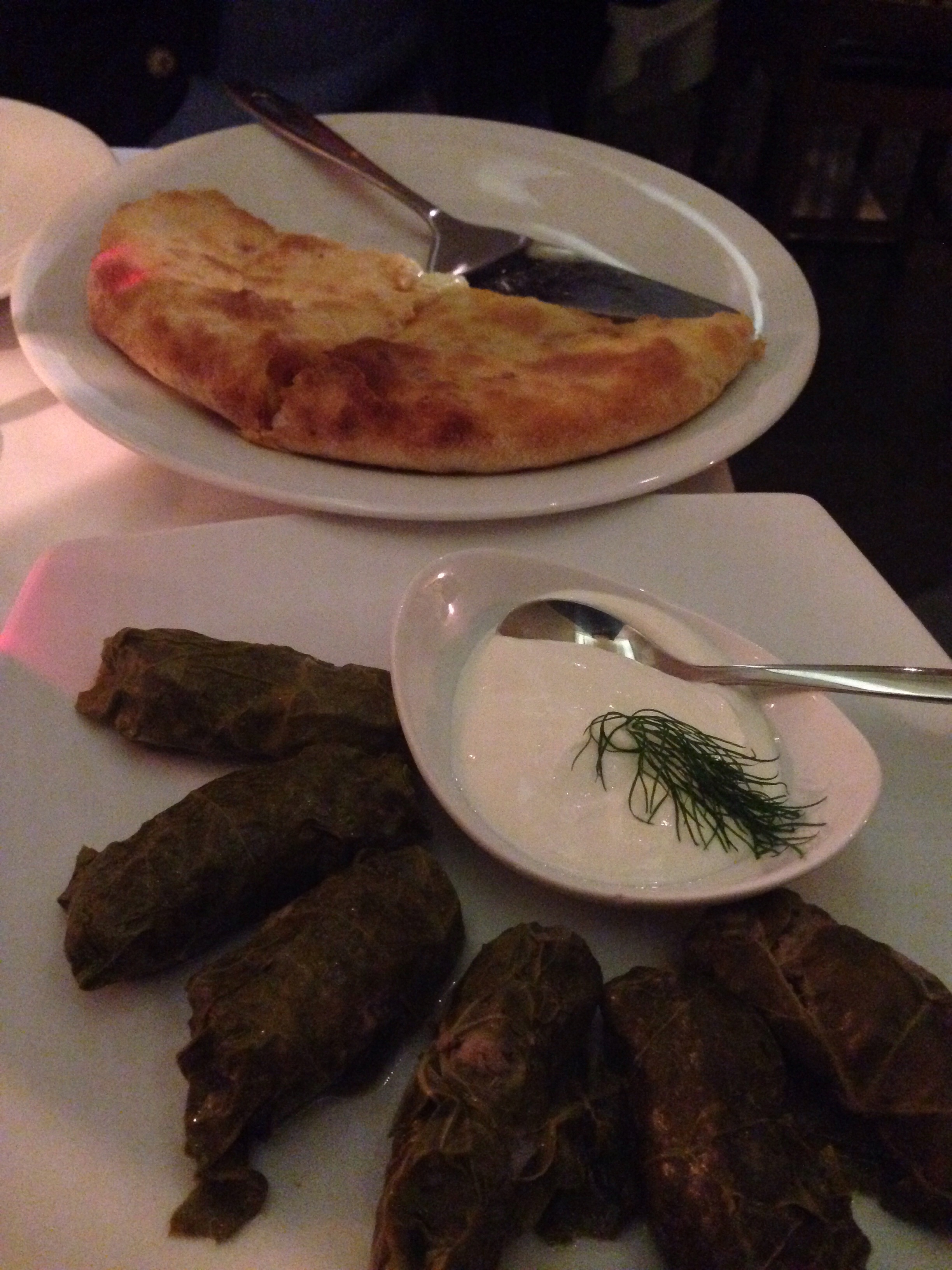 Georgiska förrätter är mättande. Längst upp ostbrödet följt av köttfärsfyllda vindolmar med smetana.