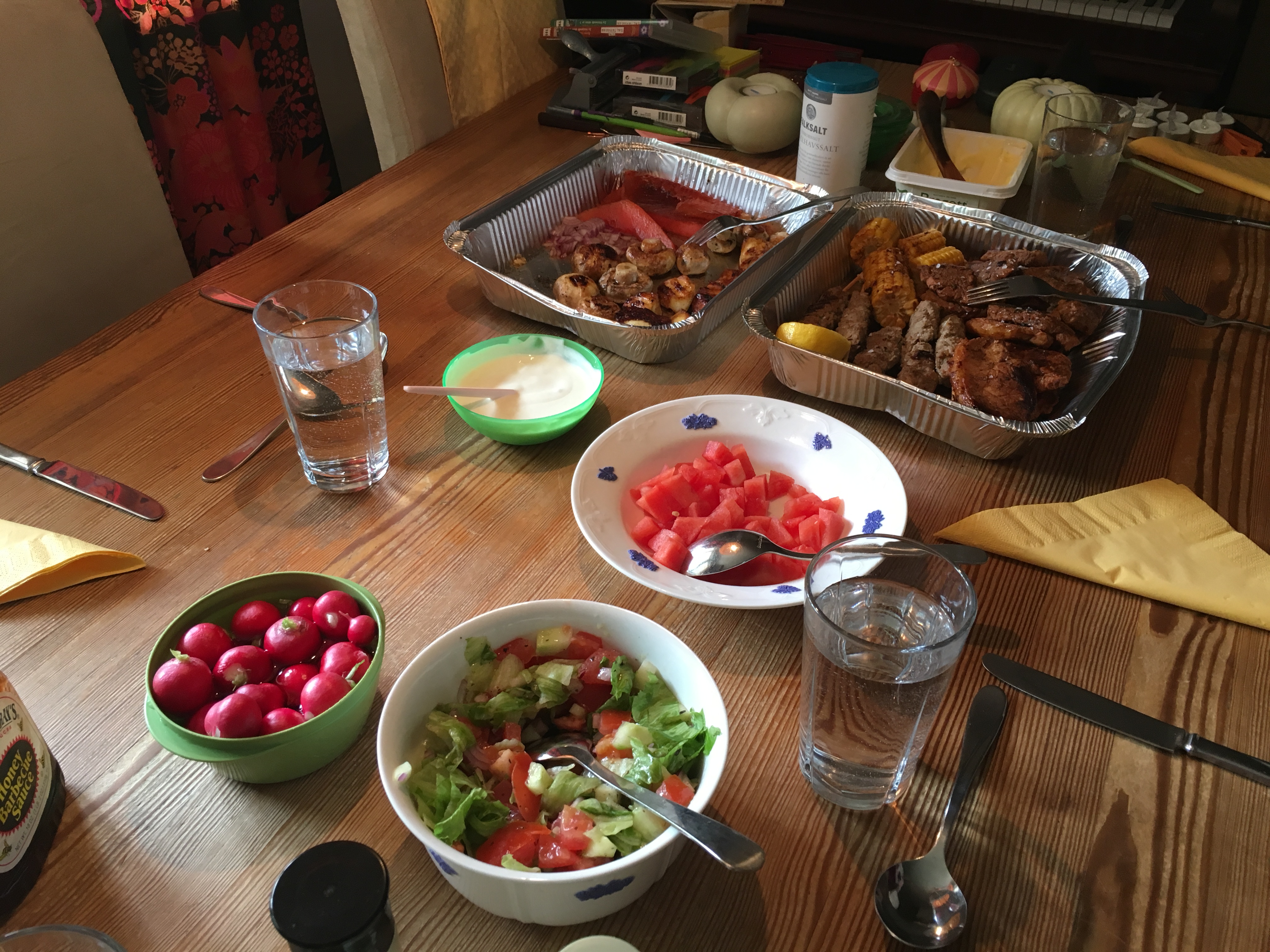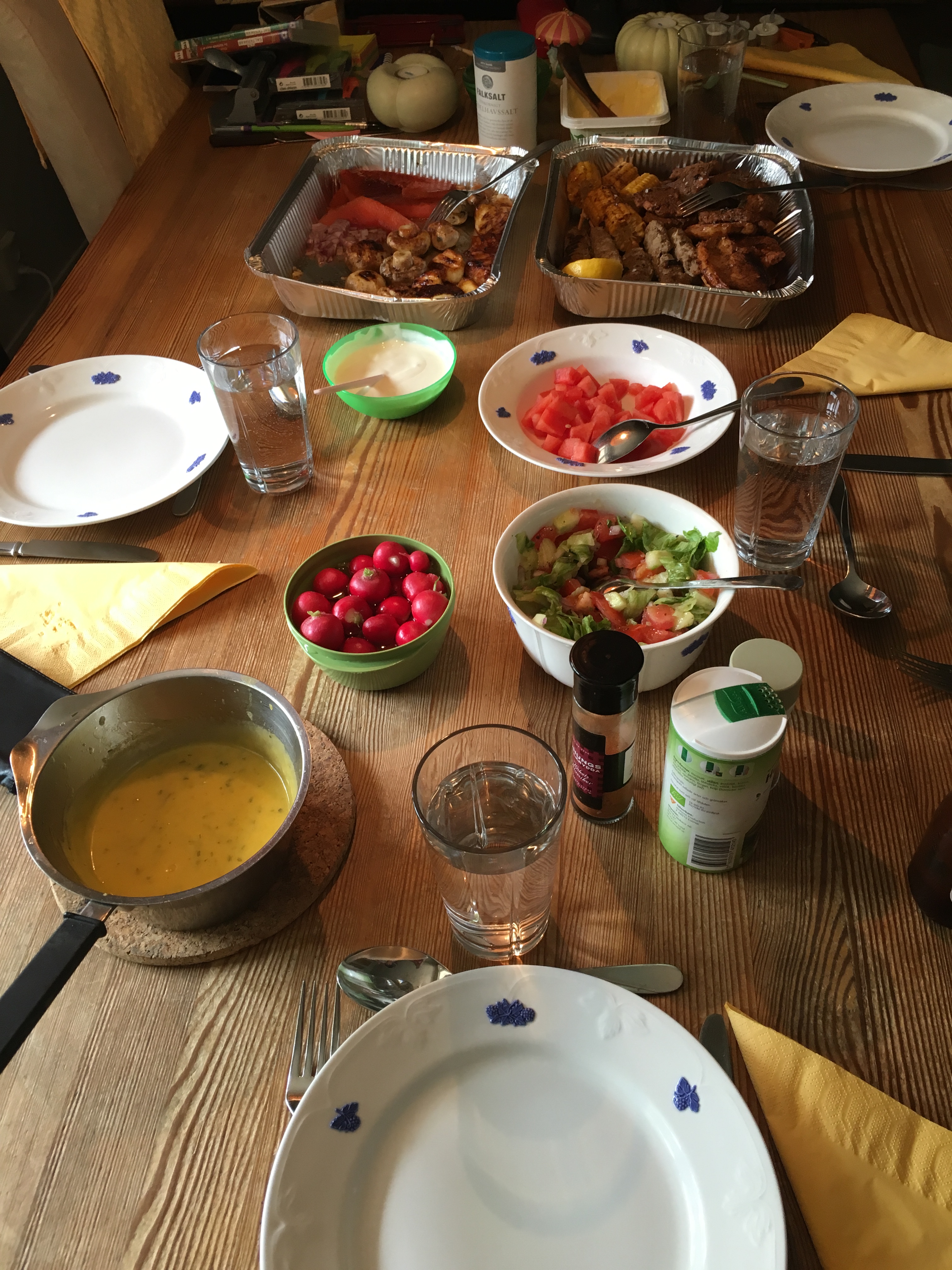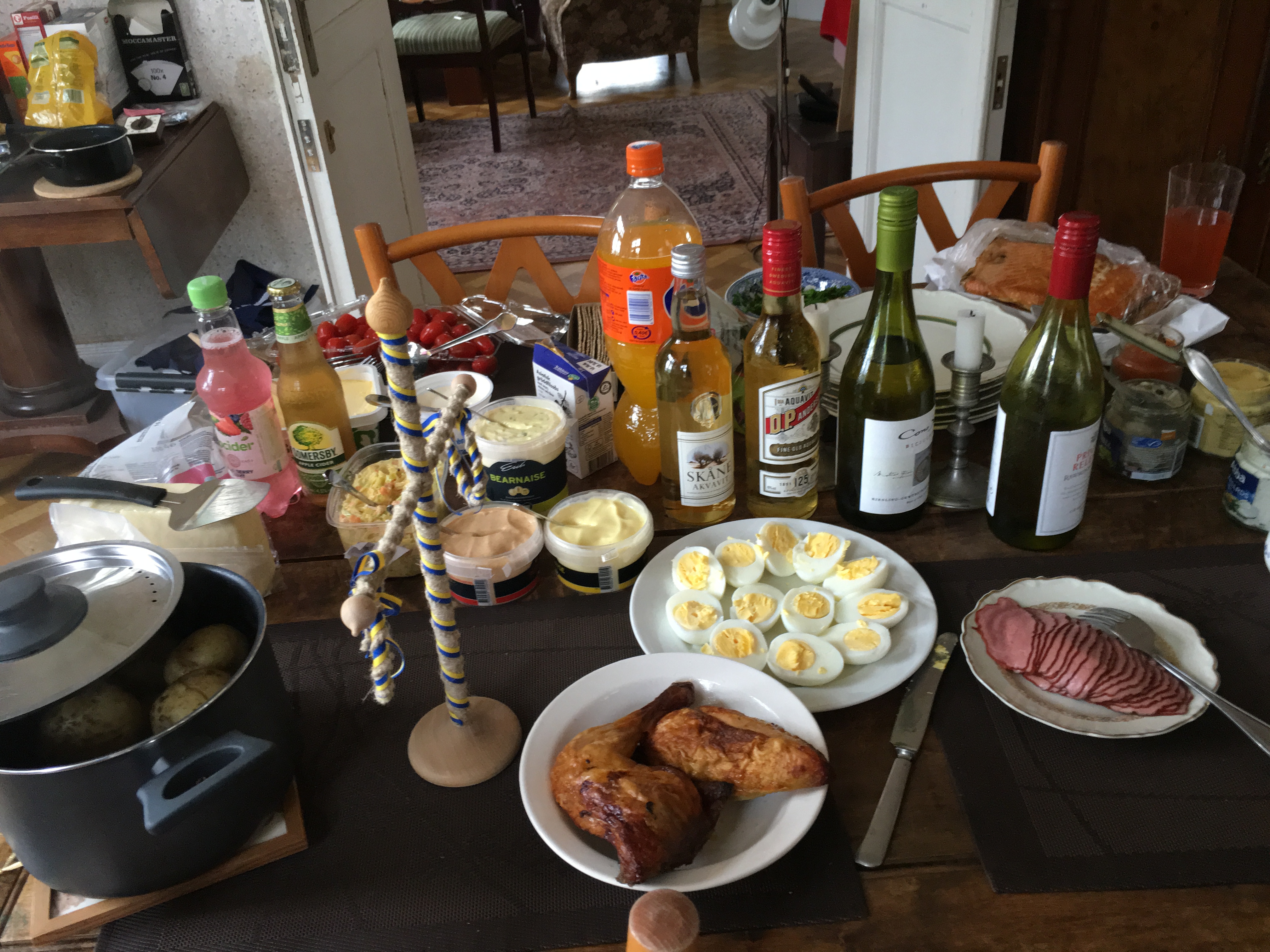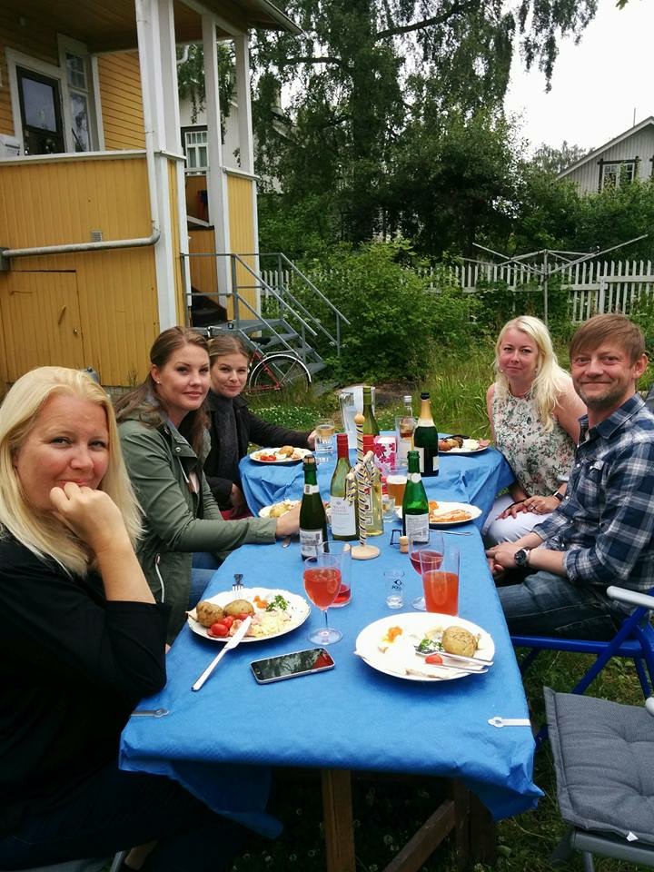 Efter att ha dukat upp ett gigantiskt midsommarbord med rökt ålandslax, sill, kokt nypotatis, gräslök, gräddfil, såser, grillat, salt kött, åländskt knäckebröd, åländsk ost, sallad och diverse nubbar satte vi oss ute i trädgården.
