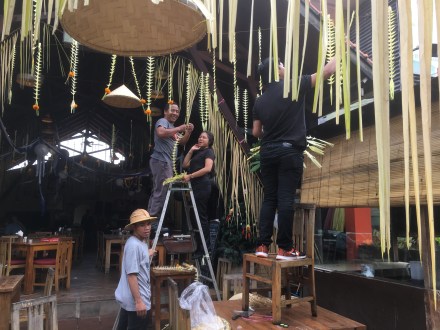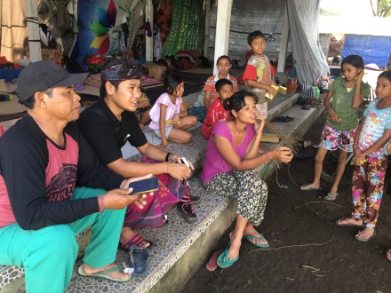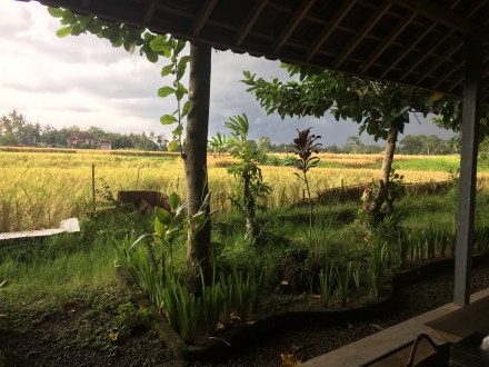 Full storm råder och på de slingriga jordvägarna vi kör på till Ubud och mellan byarna blir vattenpölarna snabbt stora. Familjer på vespor, en del insvepta i regnponchos, många barfota passerar oss. Trafikstockningar och köer är vanliga oavsett väder.