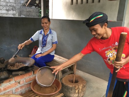 Vi är på besök på en kaffeplantage i närheten av Ubud. I en kort guidad tur får vi se hur kaffe rostas mals och tillverkas, fram på bordet under pausen kommer en bricka med en hel uppsättning olika te- och kaffesorter att provsmaka och små bananchips. Palmmårdarna, de söta små djuren som är lite överallt på området, lever på plantagen och äter de söta och mogna bönorna. Bönorna som sedan kommer ut den naturliga vägen används för att framställa Kopi Luwak, ett speciellt kaffe.