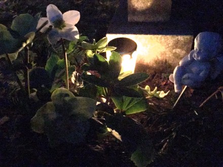 Tillbaka vid graven; ljuset i lyktan fladdrar till i blåsten. Ovanför mitt huvud blickar stjärnorna ner på jorden likt ljusen inne i kapellet och jag anar Karlavagnen långt långt borta på natthimlen. Överallt ur mörkret glimmar ljusen som satts på gravarna.