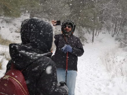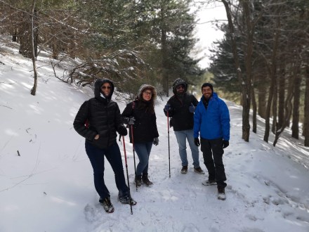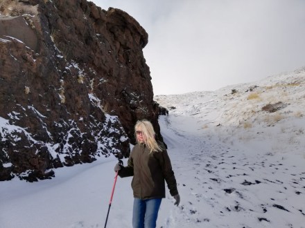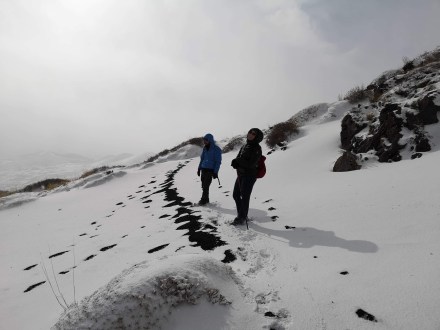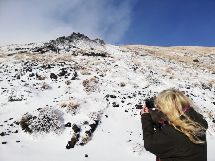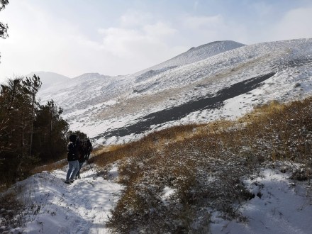 Det är ett förtrollat vinterlandskap som möter oss när vi äntligen börjar vår vandring. Ett fruset sagoland inkapslat i snö där cypresser och pinjeträd sticker upp ur allt det vita. Den smala stigen leder högre och högre upp, då och då görs korta pauser för att beundra utsikten och hämta andan. Uppe i det otillgängliga bergspasset som vi når efter cirka två timmar kan vi blicka ner i en skarp ravin där det syns en lång svart sträng av stelnad lava från senaste utbrottet. Solen bryter fram bakom molntäcket och snön gnistrar runt omkring oss i det starka ljuset så att ögonen tåras, luften är hög och klar att andas där vi befinner oss på 2 100 meters höjd. På Europas mest aktiva vulkan som då och då ruskar yrvaket på sig ur vintersömnen.