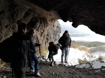 Etna ligger på Siciliens östkust där kontinentplattorna Europa och Afrika möts och skrapar mot varandra. Berget är över 3 300 meter högt. Men medan exempelvis Vesuvius är mindre aktiv men också farligare när den väl får ett utbrott, är Etnas utbrott inte lika explosiva. Guiseppe pekar och visar att det skapats en naturlig barriär av lavasten från tidigare utbrott på den sida av berget vi befinner oss, som stoppar lavans framfart. Det känns betryggande när vår vandring leder oss allt högre och stigen blir allt smalare. Ett felsteg och du halkar rakt nerför en 30 meter hög brant i ett hisnande djup. Vi når nästa mål, en liten grotta på bergssidans sluttning där vi stannar och vilar och där vattnet stelnat i istappar. En iskall vind virvlar omkring snö i luften. Utsikten är vidunderlig.
