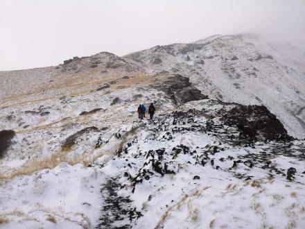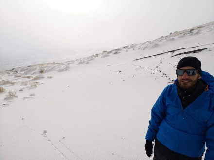 Snön faller i mjuka flingor över de branta, slingrande bergsvägarna. Vi är på väg uppför Etna till fots och lukten av svavel känns tydligt i luften. Under det snötäcke som redan bildats på marken anas den svarta vulkaniska sanden och de porösa lavastenarna. Berget Etna har mer eller mindre varit en aktiv vulkan i en halv miljon år och sagorna som omger platsen är många. I en antik myt besegrades det odödliga monstret Tyfon, som hade hundra ormhuvuden, av Zeus. Tyfon som stred om världsherraväldet med Olympens gudar stängdes in under berget där han lär ruva än idag och enligt myten är det hans andedräkt som orsakar vulkanutbrott och lavaströmmar. Det senaste utbrottet skedde under julhelgen då 130 jordskalv registrerades och flygplatsen i Catania tvingades stänga. Vi klättrar uppför en backe. Plötsligt stiger ett moln av ånga upp mot himlen.
