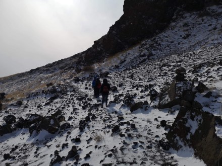 Det tar ett tag att åka bil från Catania. Gradvis ersätts solstänkta olivträd och blommande buskar med snötyngda buskar ju högre upp i bergen vi kommer. Medelhavet förvandlas till en diffus hägring och skugga i fjärran under det tjocka molntäcket. Polisen är ute och stoppar alla bilister som inte har snökedjor på däcken. Vår guide Guiseppe är raskt framme och sätter på kedjorna under en kort paus medan vi byter om till varmare kläder. Ett tag är sikten på vägen noll, snödimman förvandlar allting till en vit ogenomtränglig vägg. Plötsligt blir det ljusare, solen kikar fram och efter en snabb espresso på den lilla baren som även säljer föremål gjorda av lavasten, Limoncello, vin från Etna och vykort, förser sig vår grupp med vandringsstavar och trär på ryggsäckarna. Vi råkar ett hus halvt begravt i stelnad lava, bara övervåningen är synlig, men även om det ser brutalt ut hann invånarna undan i god tid eftersom lavan rinner långsamt berättar Guiseppe Nicolosi.