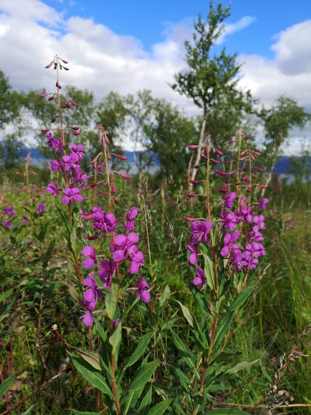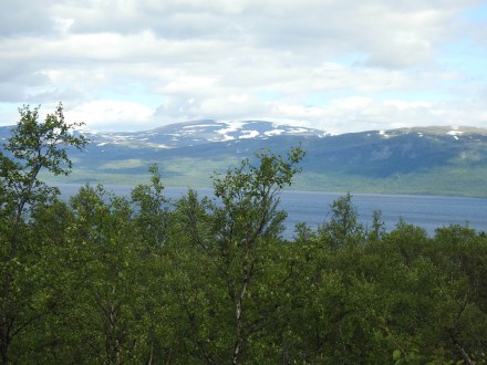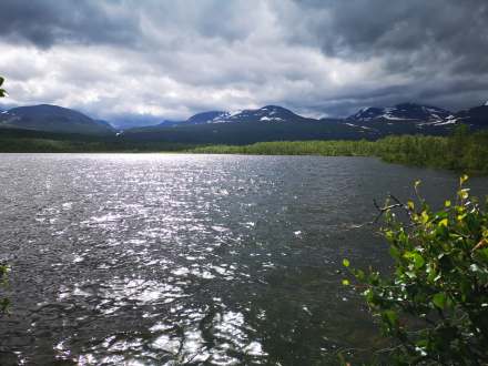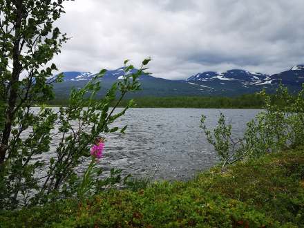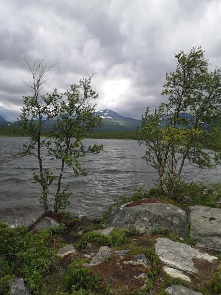 Men jag hinner stanna länge vid sjön. Slår mig ner på en sten och blickar ut över vattnet. I fjärran syns de avlägsna fjällen med sina snötyngda toppar och blå silhuetter. Bakom mig surrar mygg och knott i snåren. Några små vita blommor på rangliga stänglar höjer sina huvuden ovan ljungen. Tittar man ner i vattnet i sjön syns stenarna som slipats släta av vågorna i årtusenden i olika färger. Det är ett evigt växelspel mellan ljus och mörker. Mellan regnets skugga och solen som bryter fram bakom molnen. I sjön häckar storlommen och man ska tydligen kunna se silvertärnor, men det verkar inte som om några fåglar är ute eller så ser jag dem inte.