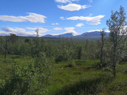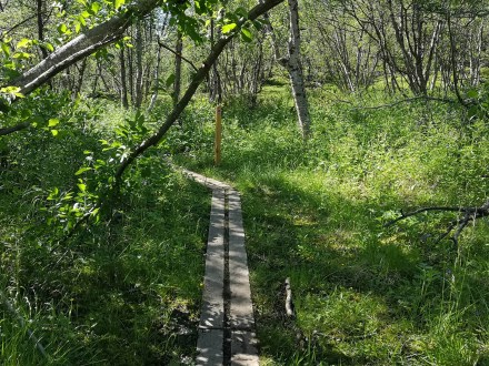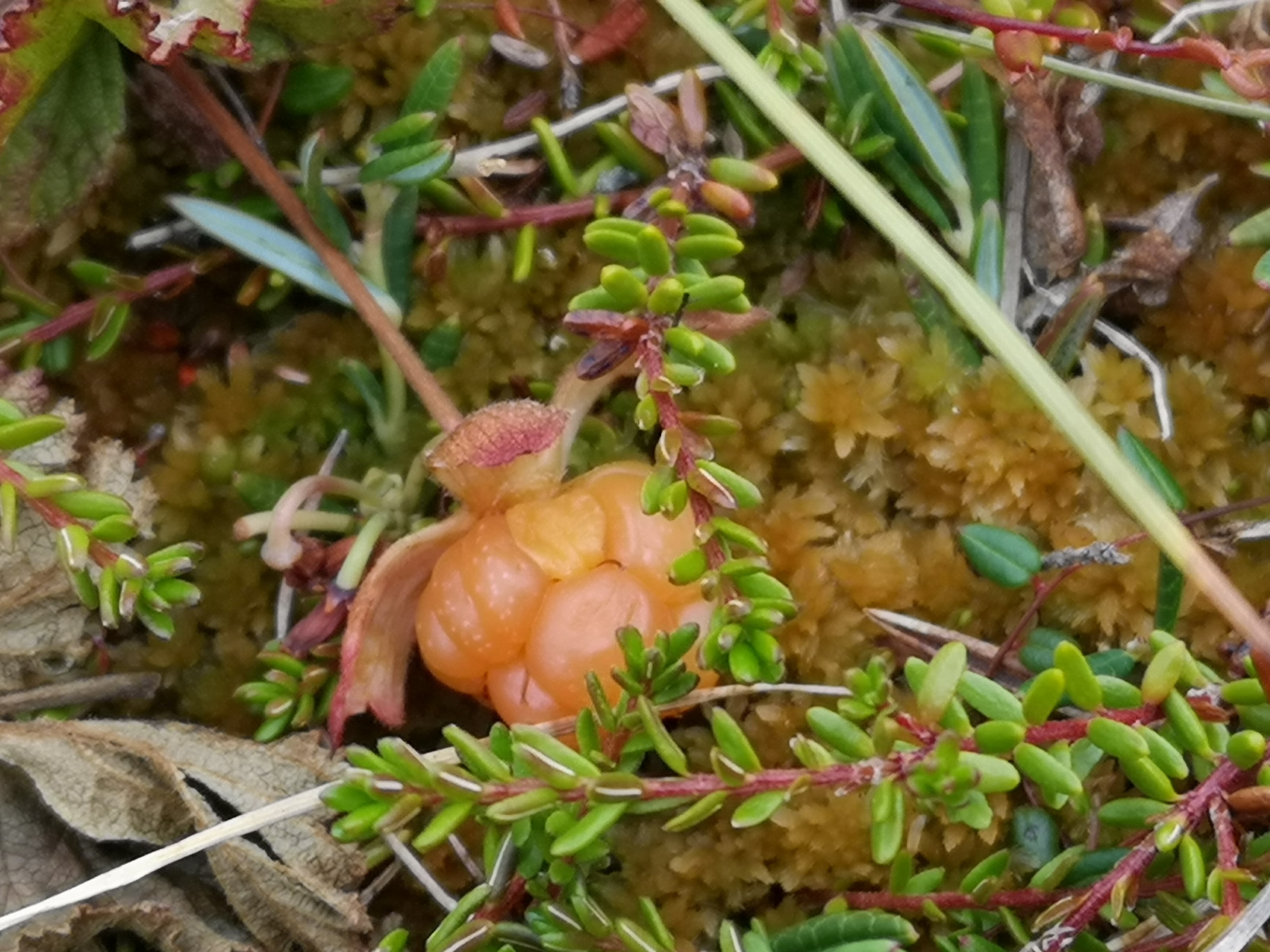 På vägen tillbaka balanserar man på smala stundtals vattendränkta träspångar över sankmarker och myrar, där hjortronen lyser röda. En del av marken utgörs av öppna fjällhedar där tjälen aldrig går ur marken. En del hjortron har redan börjat bli mogna medan andra har någon vecka kvar. Svamp finns det gott om, både Karl Johan, diverse soppar och blodriska. Vad jag kan läsa mig till är det för övrigt tillåtet att plocka bär och svamp i Abisko nationalpark.