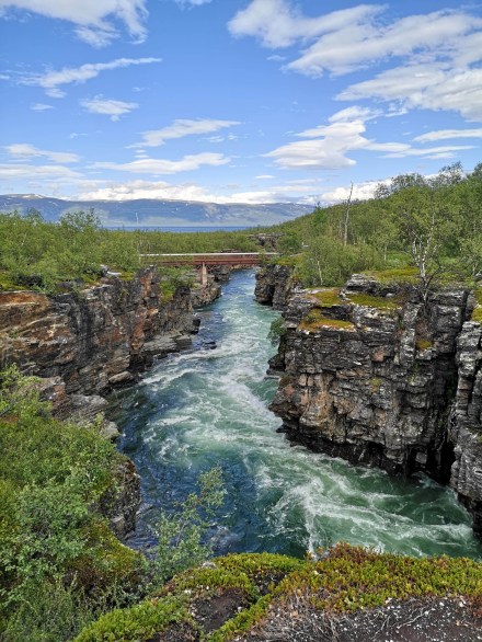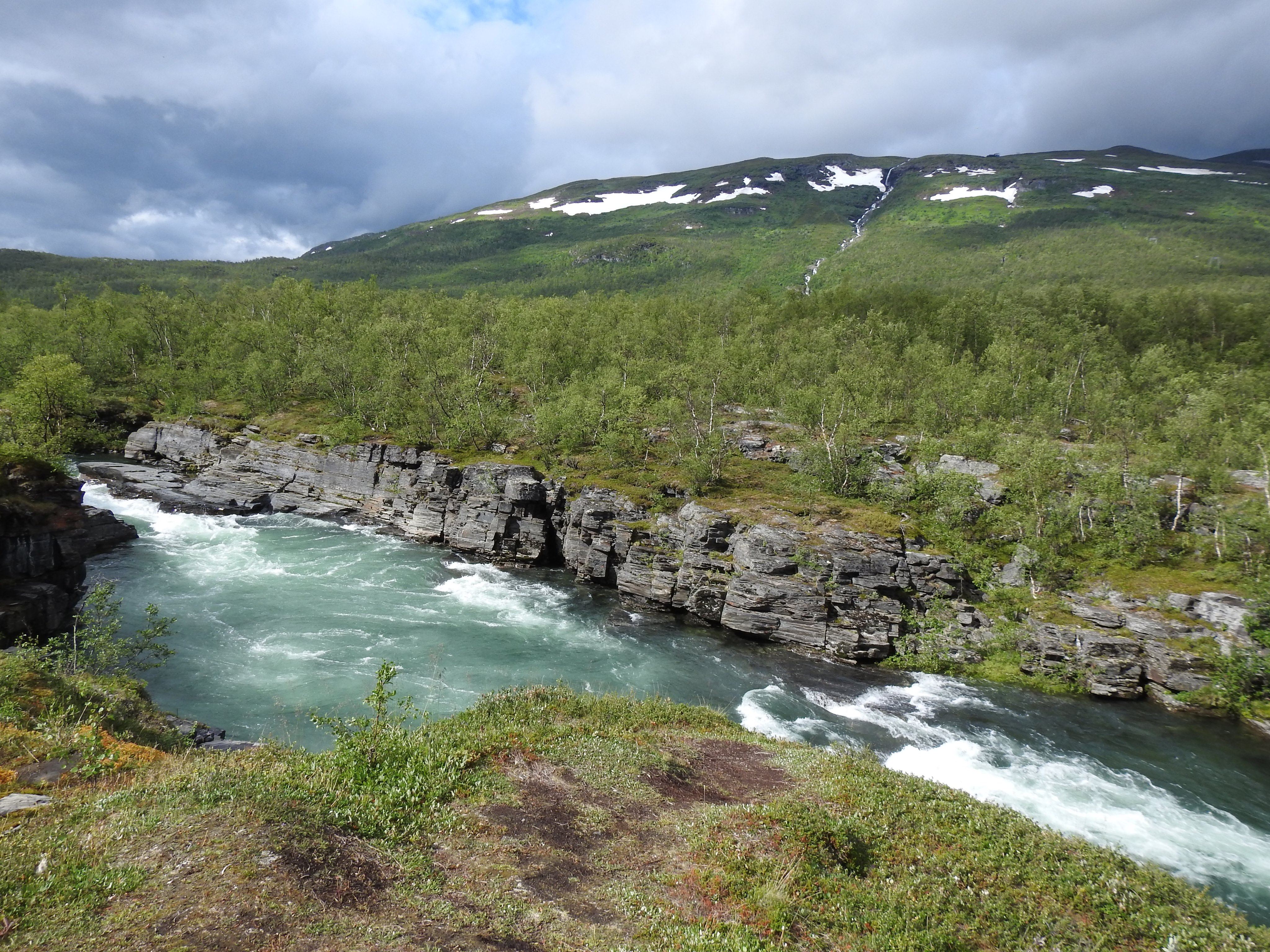 Man följer orange markeringar en bit in på Kungsleden innan man kommer fram till ”Marmorbrottet”, där det faktiskt bröts marmor på 1800-talet. Förbi och längs med den virvlande älven på vägen upp har man en makalös utsikt över klippor och vattenfall.