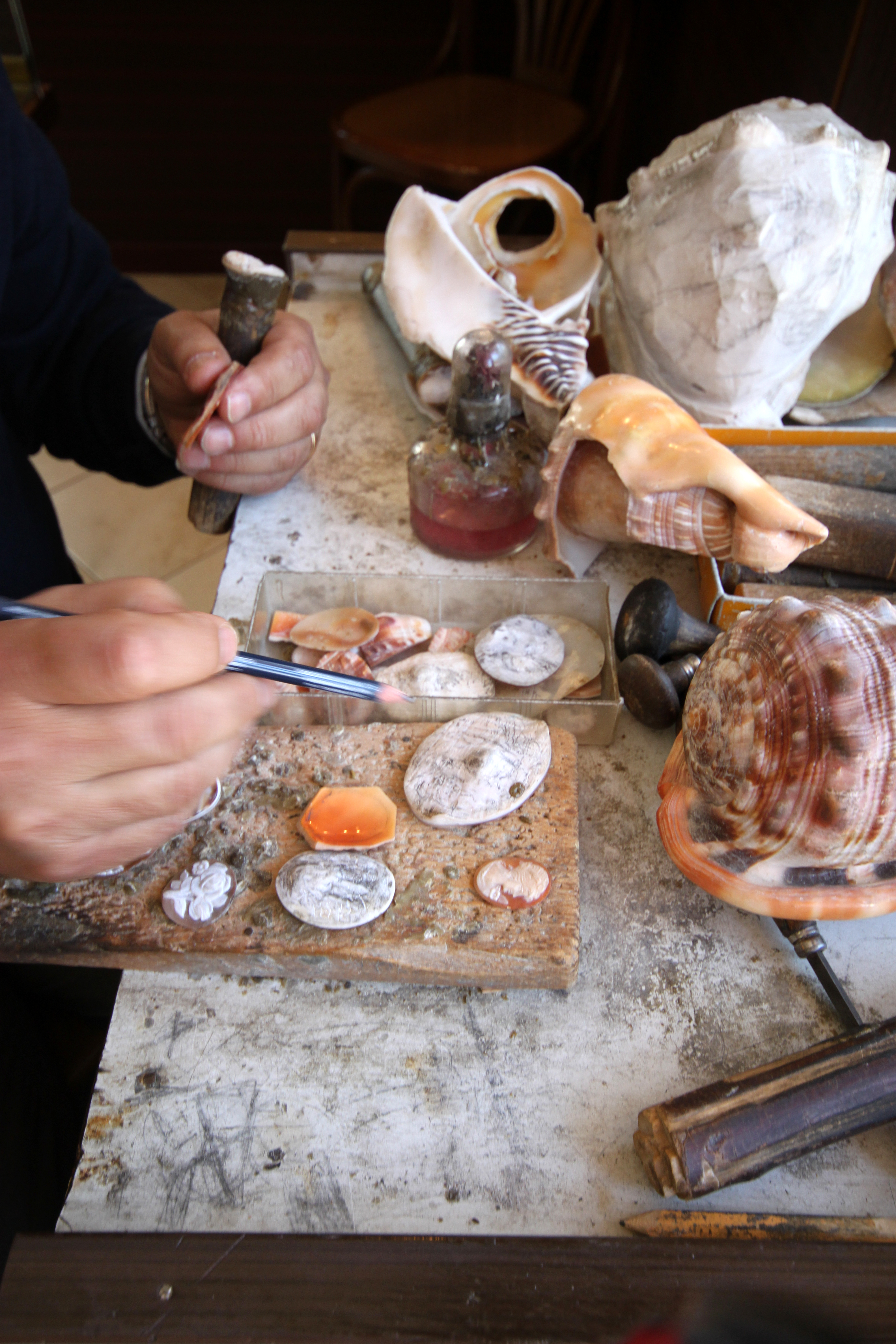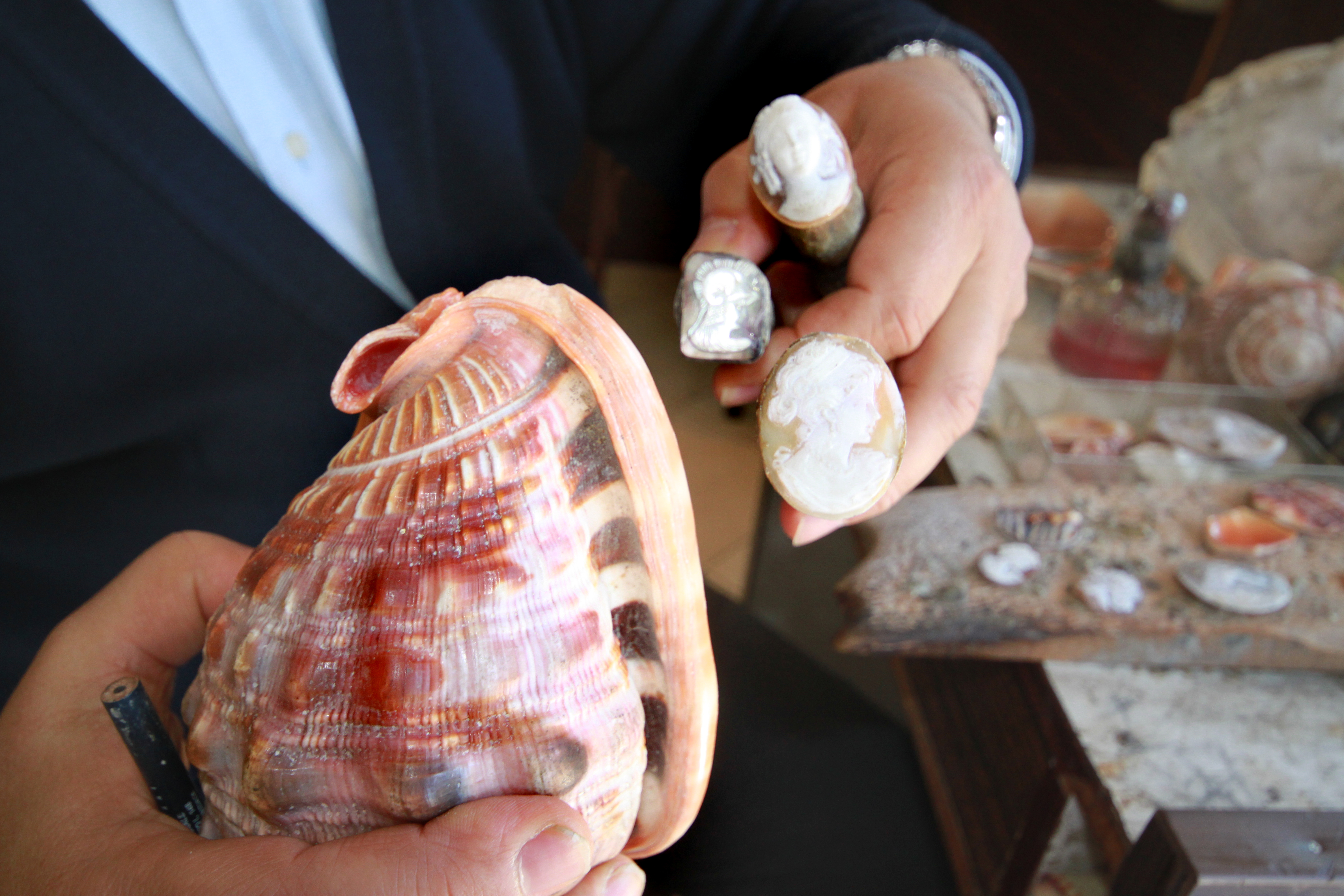”Jag lärde mig yrket av min morfar, men jag gick i skola också för att bemästra tekniken. Min far arbetade här före mig. Snäckorna beställer vi från särskilda delar av världen. Sedan får vi fram de olika färgerna genom att rista fram det vita snäckskalet. En kamé kan ta flera dagar att slutföra”, säger De Paola.