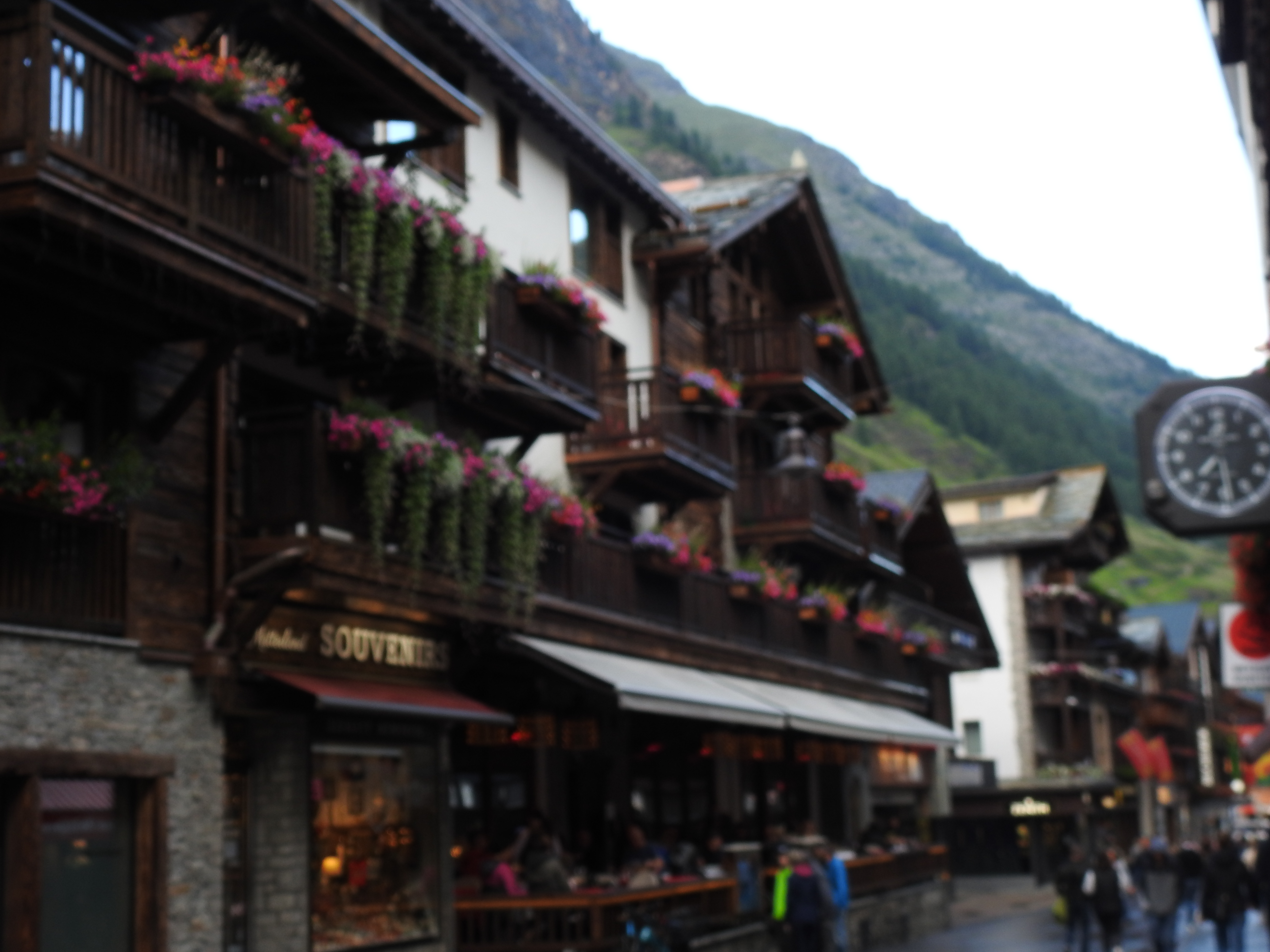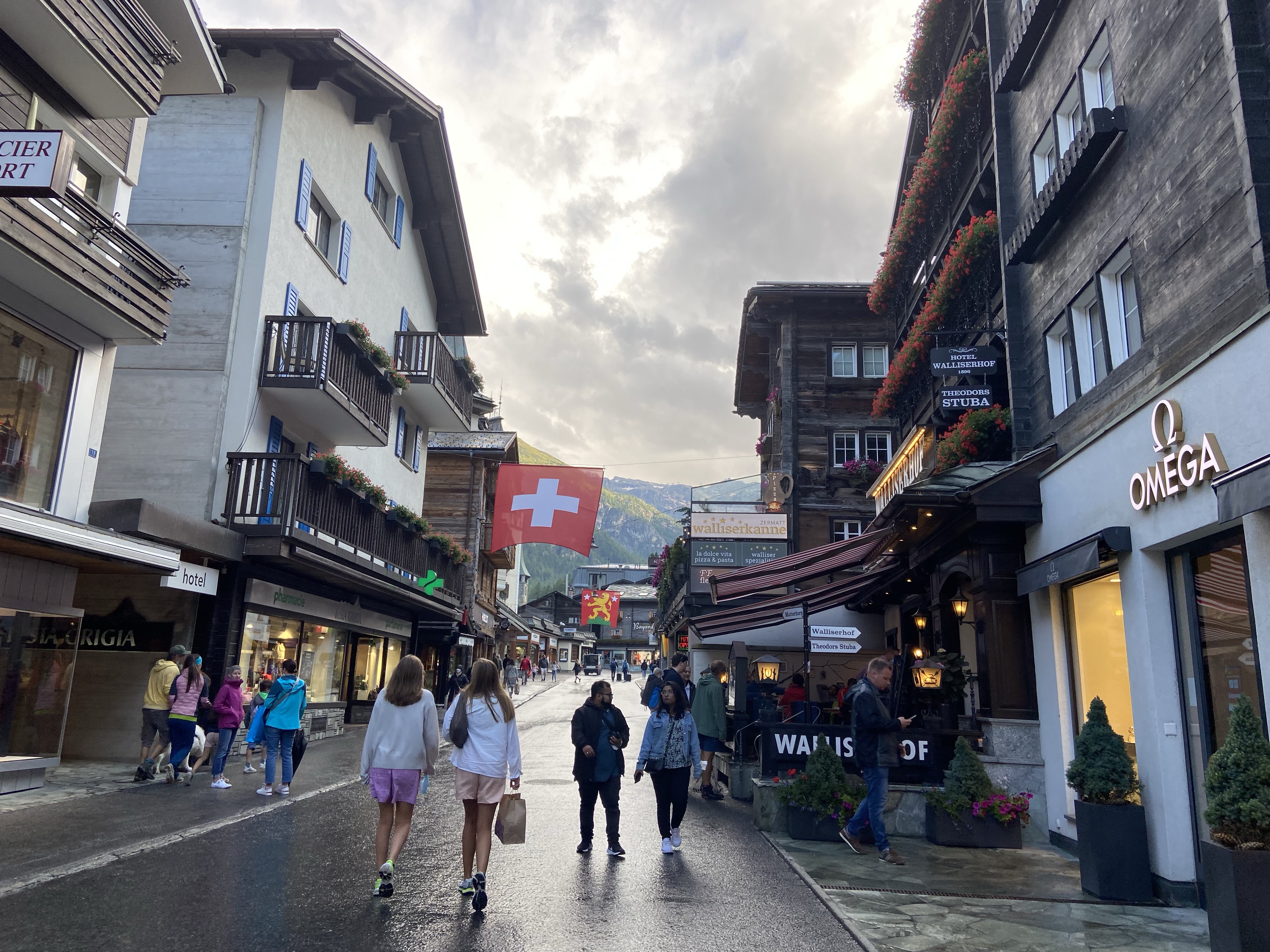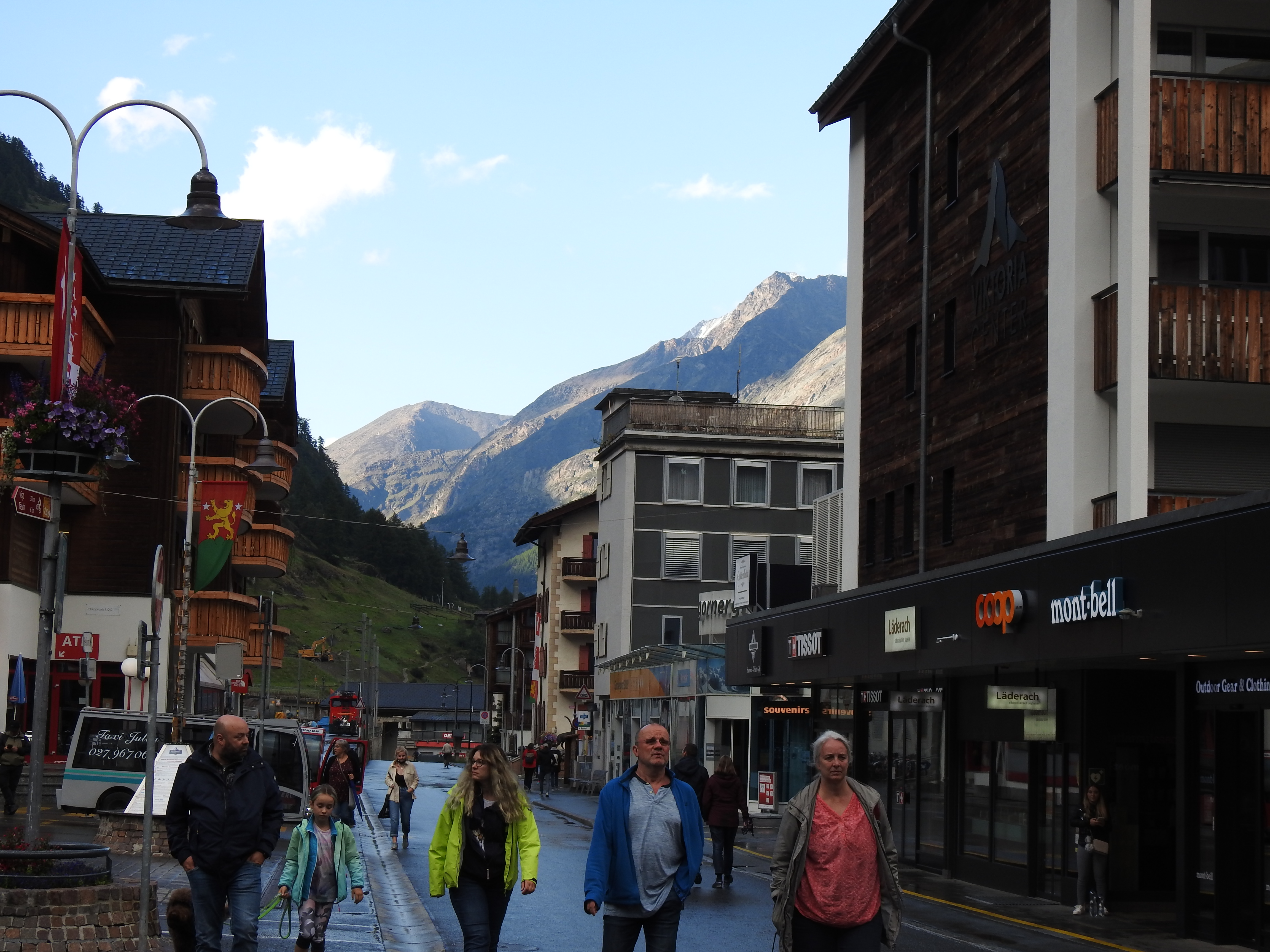 Mitt emot mig sitter ett äldre par som länge sett fram emot turen säger de, de ska liksom jag, kliva av i Zermatt, en ort och kommun som ligger i Visp i kantonen Valais. Det var en liten sömnig by som slumrade i skuggan av bergen ända tills engelsmännen invaderade området på 1830-talet för att bestiga Matterhorn. Numera är den känd både hos skidåkare, bergsklättrare, andra typer av turister (fransmän verkar utgöra en majoritet) och ABBA-fans. Anni-Frid Lyngstad bor nämligen här. En stor del av byn utgörs av gamla, timrade vackra hus med prunkande blomsterlådor och vackert målade fönsterluckor. Samtidigt finns det gott om stjärnkrogar i byn, många åker hit för att i skuggan av de snötäckta bergen avnjuta en gourmetmåltid.