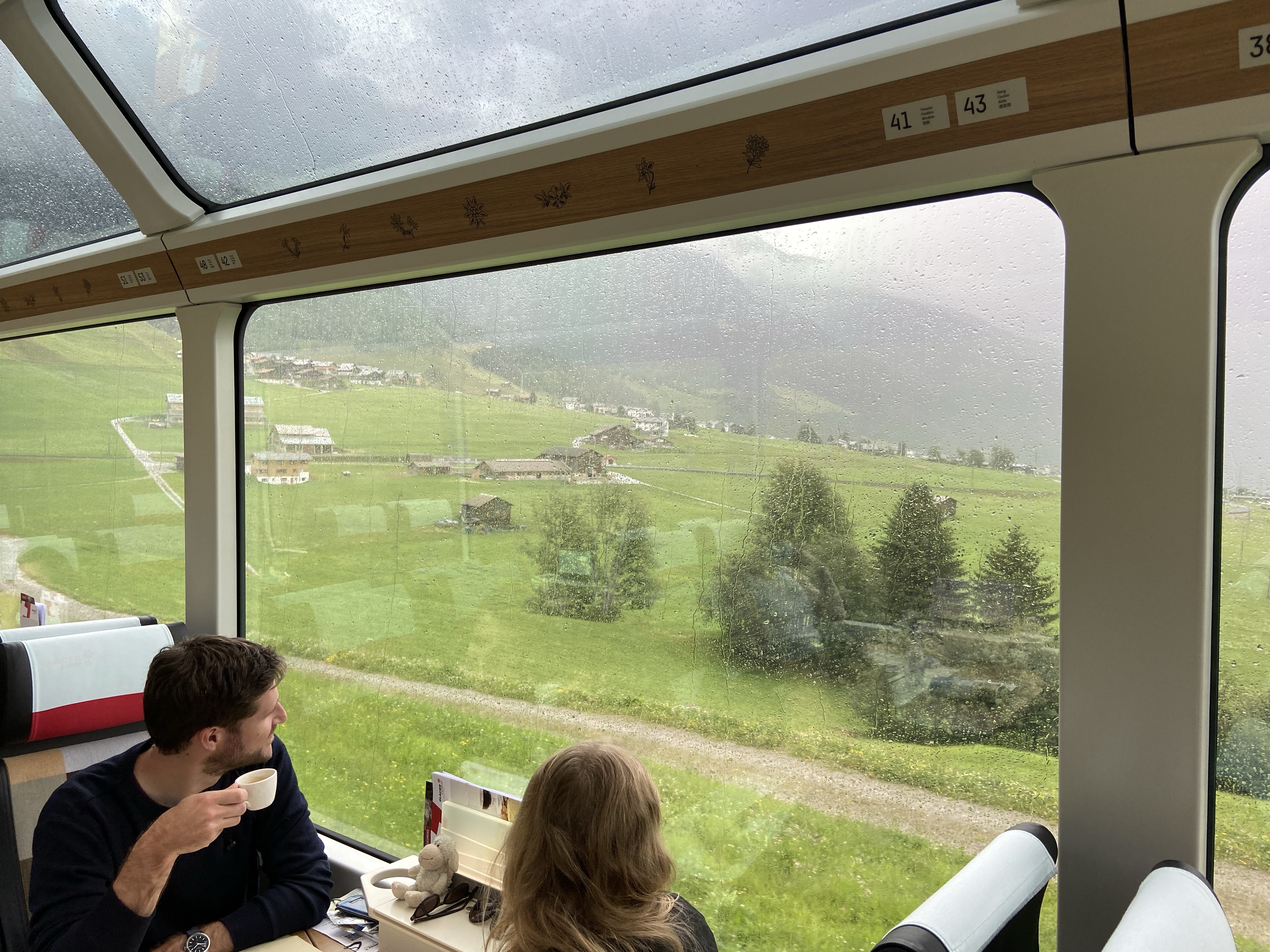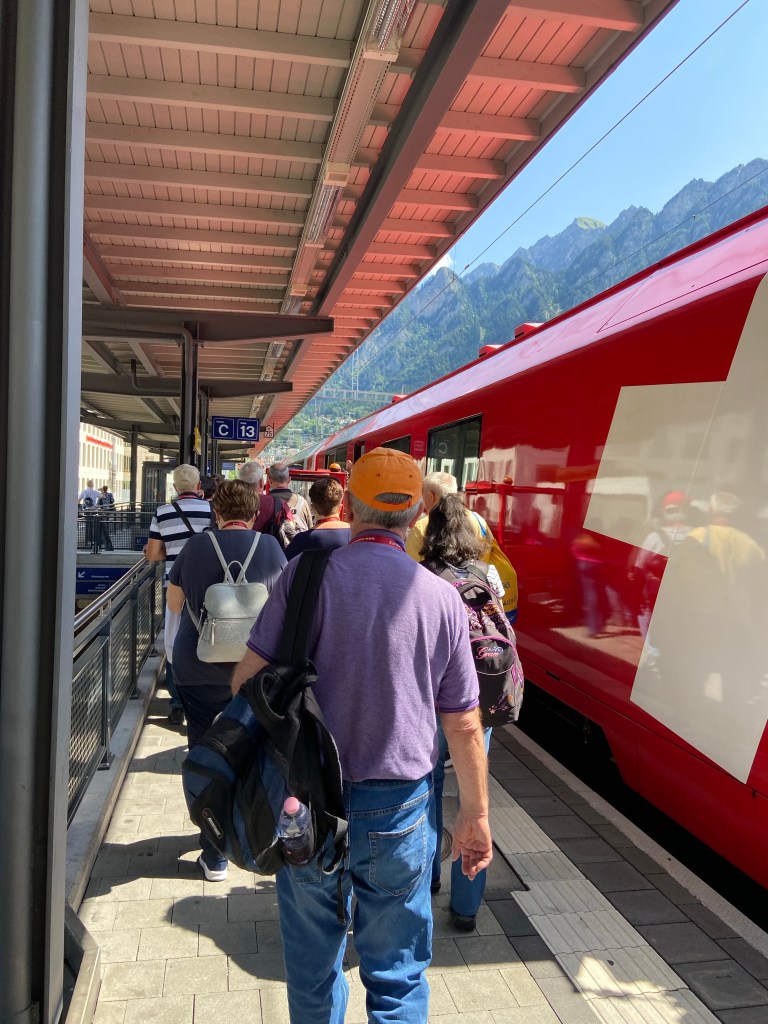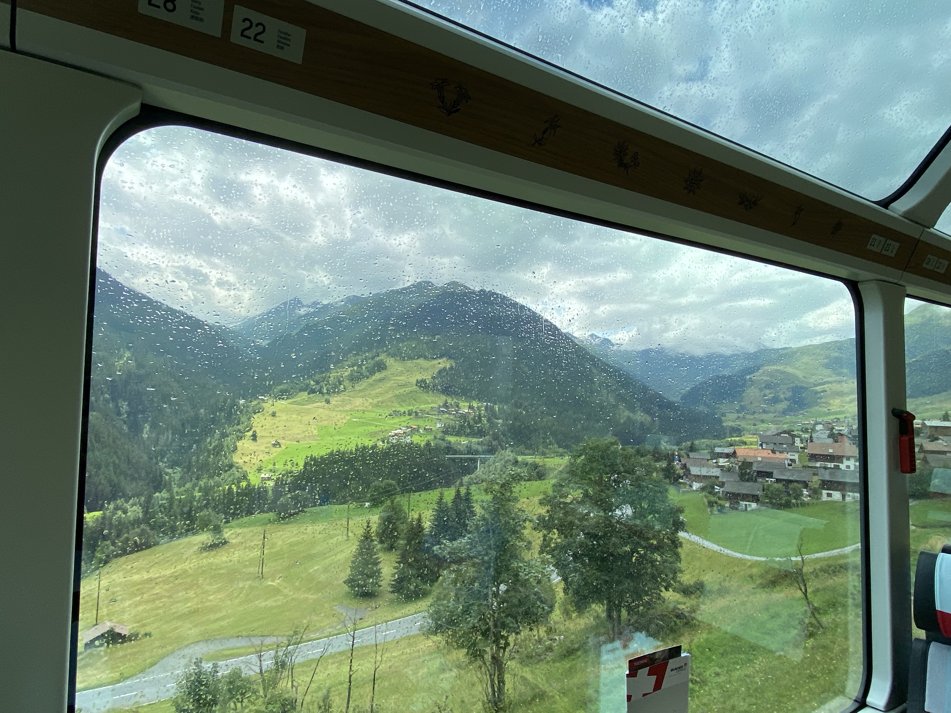 Jag byter tåg i Chur och kliver på den så kallade Glaciärexpressen som anses vara en av världens vackraste tågresor, eller som de själva gör reklam för – den långsammaste. Att åka tåg från St Moritz till Zermatt tar 8 timmar (motsvarande ungefär sträckan Stockholm-Jönköping eller cirka 29 mil). Jag hoppar alltså på i Chur och då tar det ”bara” cirka 6 timmar. Genom att köpa ett Interrailkort, kommer man undan en stor del av det dyra biljettpriset och betalar bara för platsreservationen.