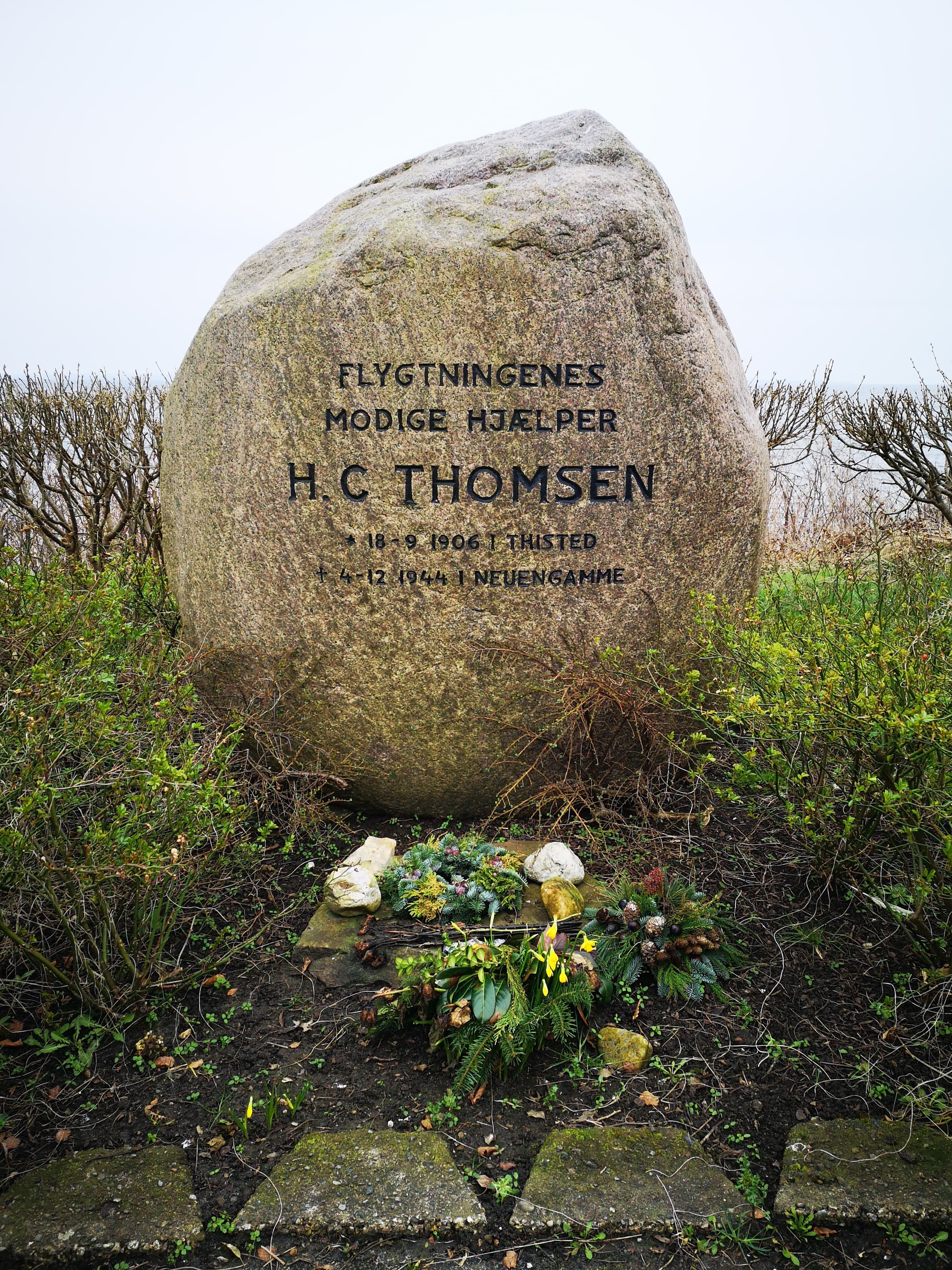 Minnessten över Henry Christian Thomsen som mördades av tyskarna, står nära platsen där Snekkerstens krog låg utanför Helsingör.