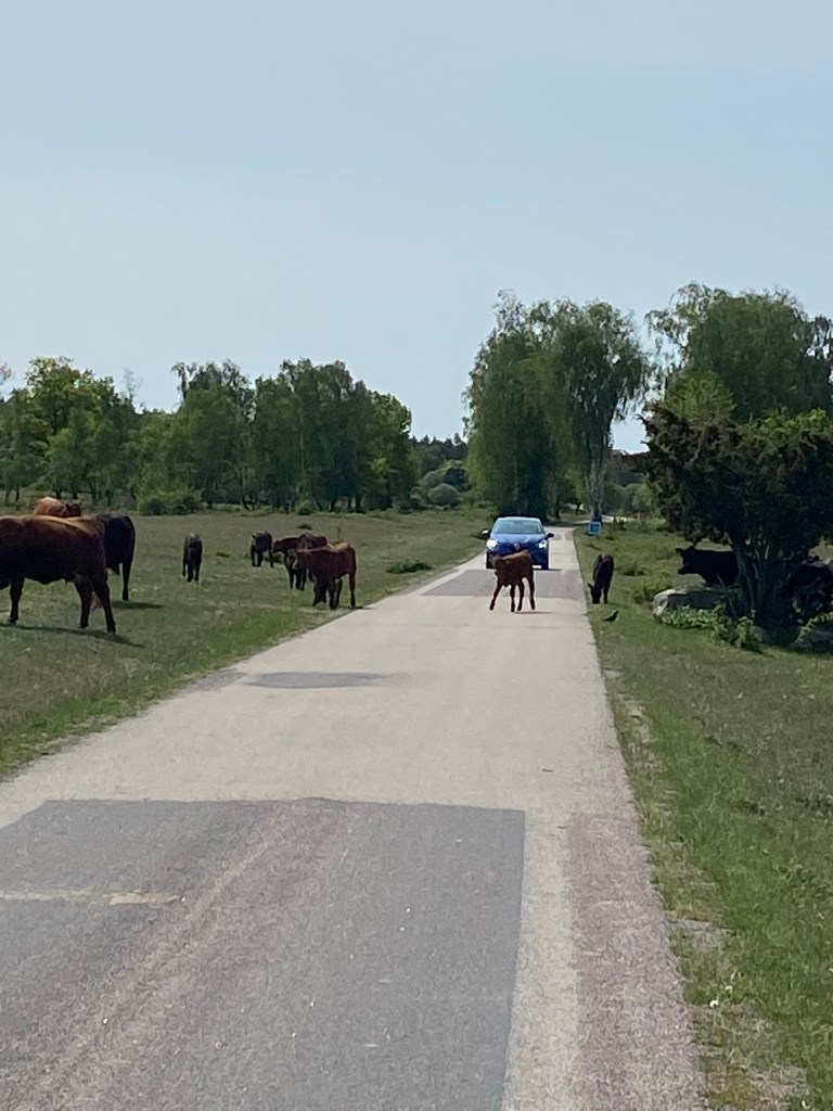 Uthyraren föreslår en tur ner till strandängarna ”där kan det finnas säl, men du måste vara uppmärksam många misstar dem för stenar när de ligger ute och solar på klipporna”. Så jag följer rådet och trampar bort mot Risinge och kusten. Jag ser en oändligt mängd sjö- och havsfåglar; gäss, måsar, sillgrisslor, sothönor, häger, fiskgjuse (?) och sådana jag inte kan namnen på. Tyvärr inga sälar. Ett tillfälligt möte med kor på vägen, som vägrar att flytta sig. I maj är annars Öland fyllt av häckande fåglar av alla dess slag. En del bygger sina bon direkt på marken i den torra, kalkhaltiga jorden på alvaret. Man kan se dem hovra ovanför huvudet, nervöst skrikande för att de är rädda att någon ska trampa på äggen, så det gäller att vara försiktig. I kölvattnet följer förstås fågelskådarna – och de kan dyka upp när man minst anar det.