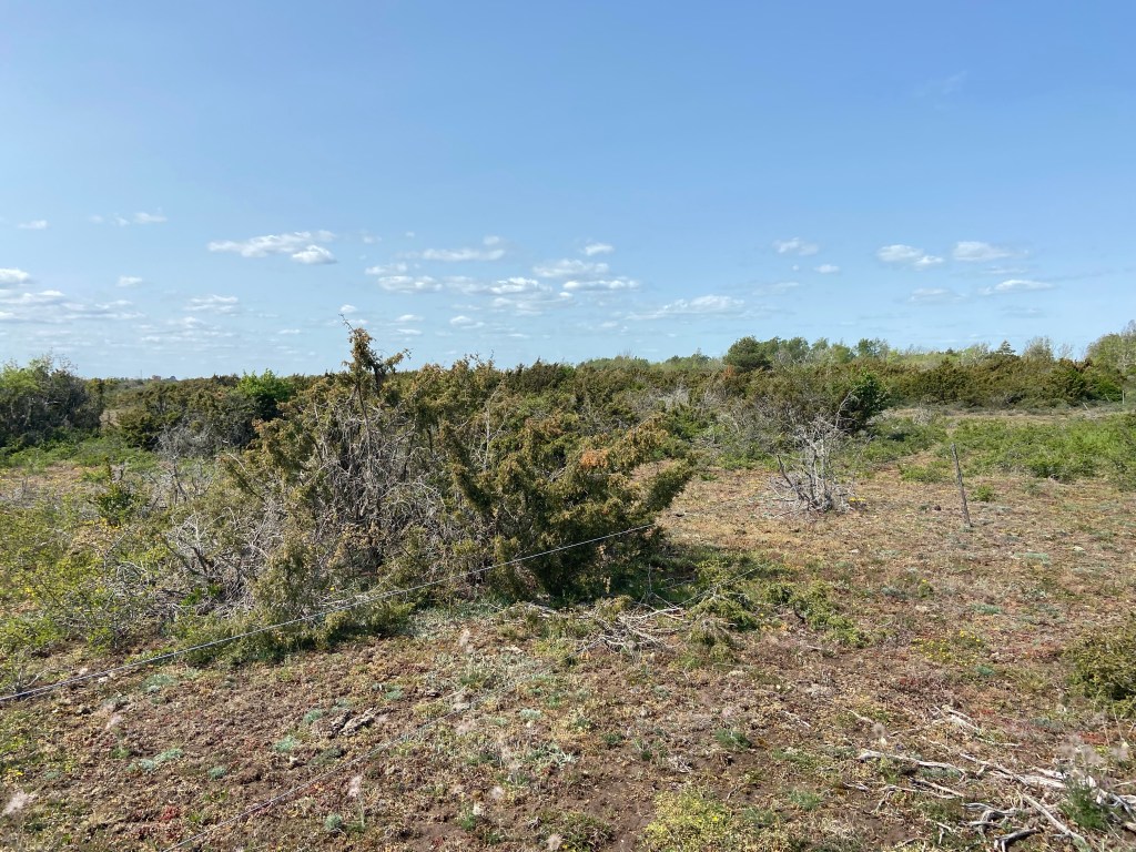 Den entusiastiske mannen är i 65-årsåldern med bar överkropp, shorts, hatt och kikare har först överfallit personerna som precis parkerade sin bil tio minuter tidigare (de är ute i samma ärende, också i hatt och i friluftskläder) och nu har han sett mig stå vid cykeln och hittat nästa offer. Han och hans fru är entusiastiska fågelskådare, frun dock lite mer timid, och han håller oavbrutet låda om vilka vandringar de gjort, vad man ska se, vad de ätit till middag osv. Frun lyckas inflika att de har laddat ner en app som kan identifiera fågeln på själva lätet om man spelar in ljudet. För enkelhetens skull sover de dessutom i pickupen, ”det går jättebra”. Jag anar att detta kan ta väldigt lång tid så efter en kvart lyckas jag slita mig loss med frammumlande ursäkter att jag har en tid att passa och åker för att hitta en annan väg/stig in på alvaret.