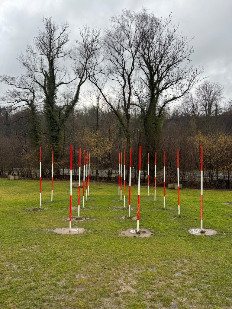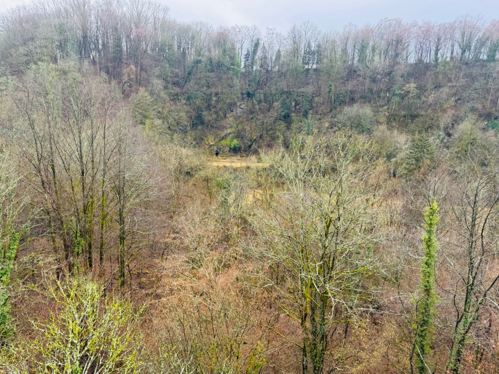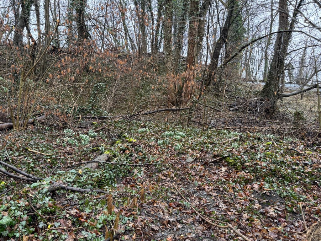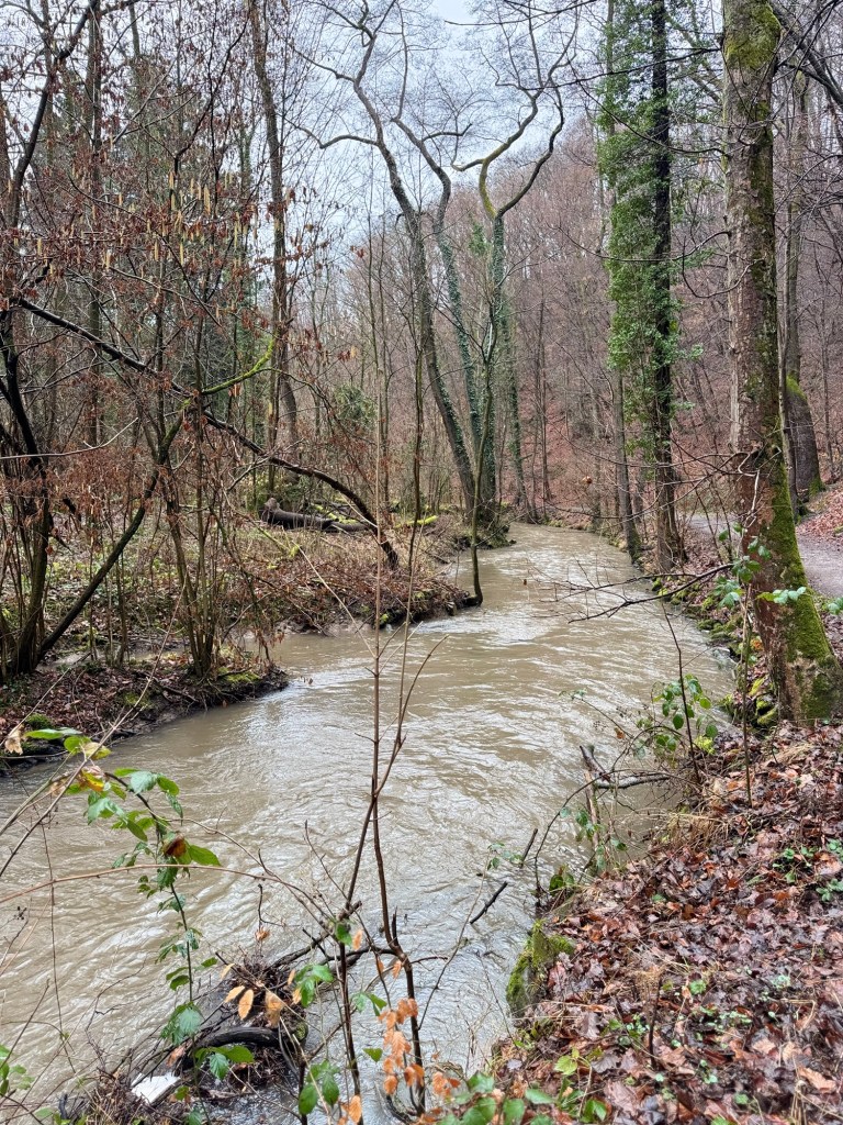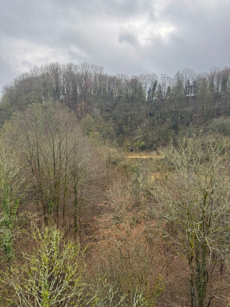 Genomdränkta och frusna följer vi den leriga stigen bort mot fyndplatsen, som löper parallellt med den trafikerade vägen där bilarna mullrar förbi.  Det är februari och naturen runt omkring oss är fortfarande i vintersömn även om spår av vårens ankomst anas i drivor av blommande snödroppar, plusgrader och doften av våta löv och jord. Träden i skogen har svarta, nakna grenar. Floden Düssel slingrar sig igenom området som ett grått töcken.