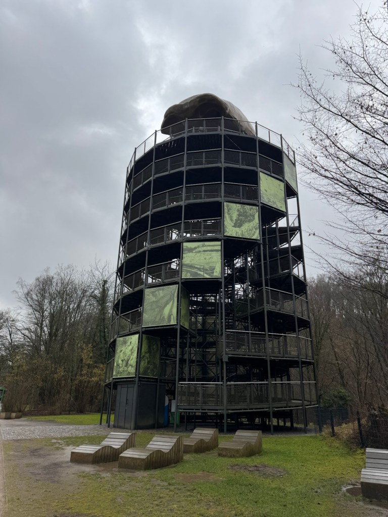 Plötsligt är vi framme, på en stor vidsträckt plats med det 22 meter utsiktstornet Höhlenblick (Grottutsikten) som öppnade 2011. Högst upp har man en fantastisk utsikt över dalgången och platsen där Feldhofer-grottan än en gång lång.