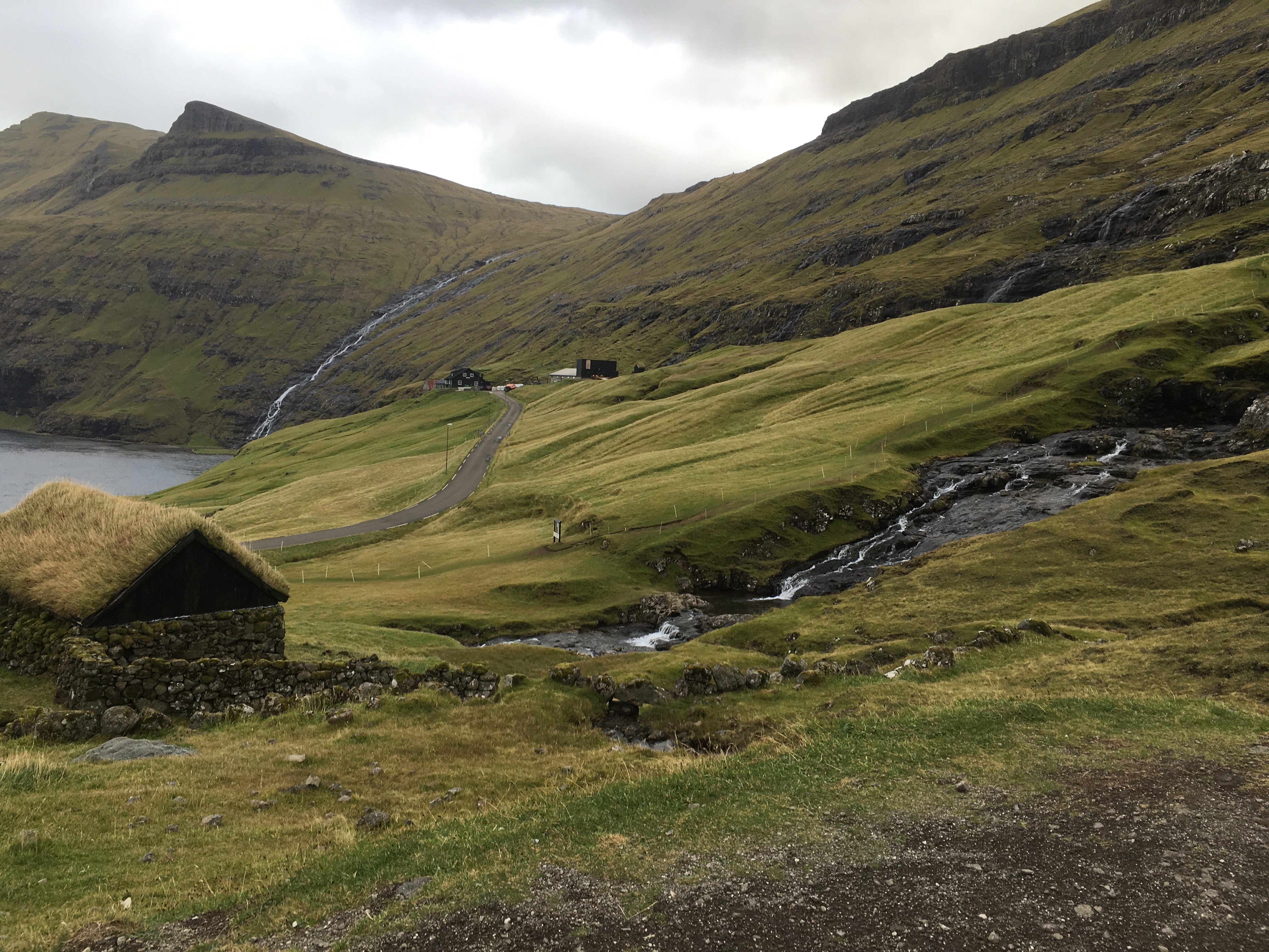 Vattenfallet Vikafossur, där vinden är så stark att vattnet blåser uppåt och sidledes, är ett annat stopp. Sedan är vi framme vid Saksun beläget vid en lagun på inlandet av den nordvästliga delen av Streymoy och en av de mest fotograferade platserna på Färöarna, med de små karakteristiska husen med grästäckta tak. Överallt längs vägar och på sluttningar betar får med tjocka pälsar i färger alltifrån gyllene brunt, till brokigt, vitt och svart. Då och då syns flockar med tamgäss, gås är för övrigt vad som vankas på julbordet. Längs en stig som löper rakt upp i bergen står en samling bilar, det är markägare som är ute för att hämta in sina får för slaktsäsongen som startar i oktober. Ett hårt arbete berättar vår guide men gör en paus och kikar upp mot himlen; ”men ok idag, det regnar i alla fall inte”.
