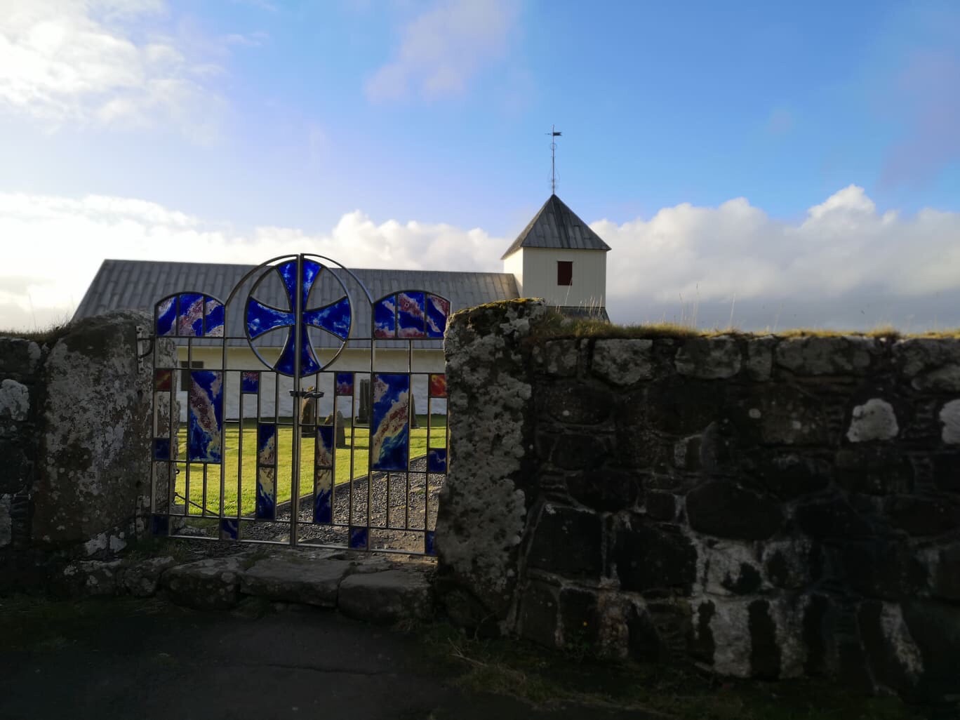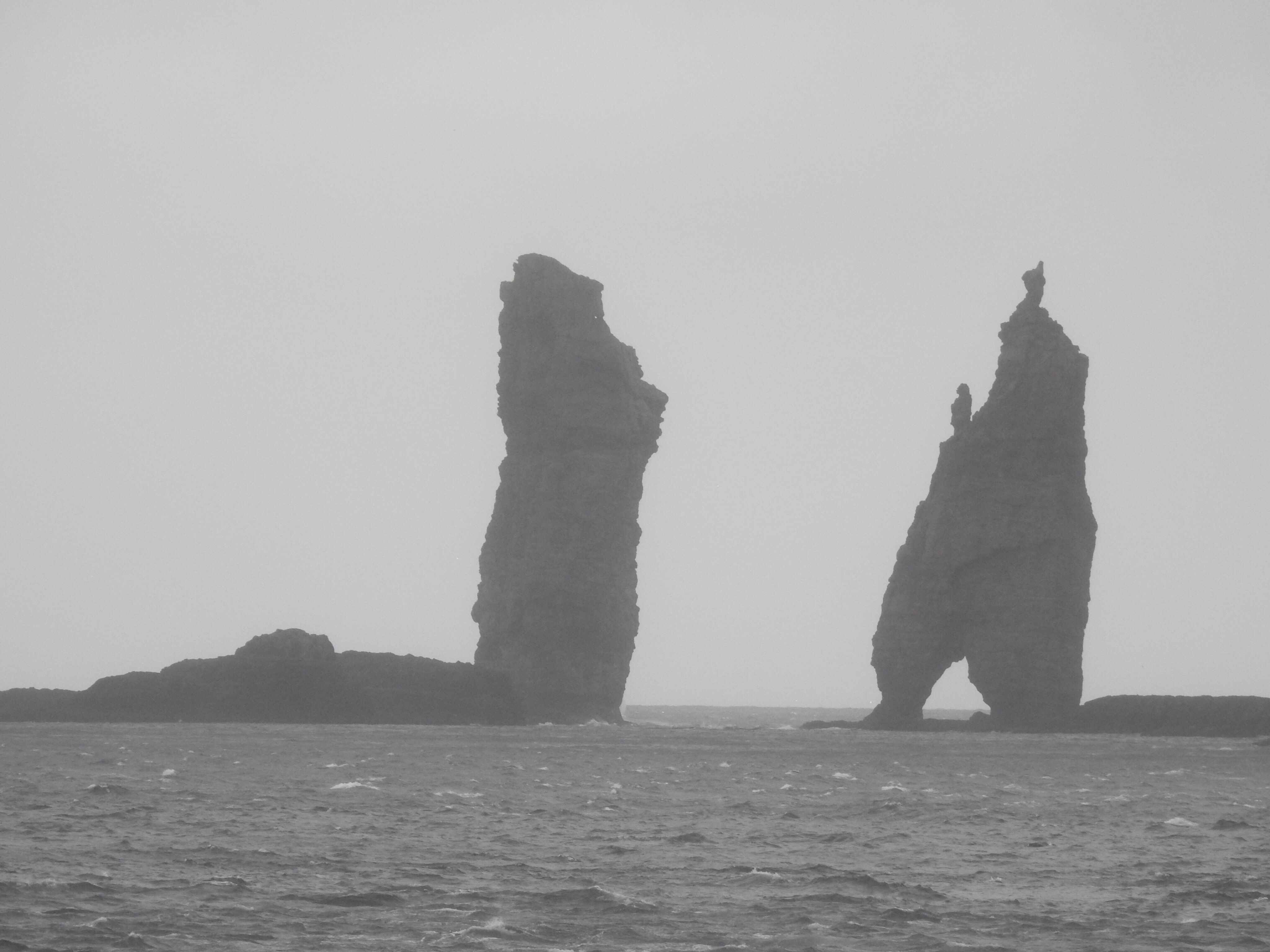 Han har en poäng. I Saksun har vinden tilltagit och ett lätt duggregn hänger i luften. Dimman stiger upp ur marken och sveper in gräset i ett ulligt duntäcke. Det blir svårt att se handen framför sig. Vi går i en rad längs med en sluttning med utsikt över lagunen och vattenfallet bakom oss. Vinden gör att orden flyger iväg och öronen ringer. Det känns som om någon iakttar oss, något alldeles bakom ryggen. Men när jag vänder mig om finns det ingen där. Bara stenar, några kullar och dimman. Ur vilken vakande grå ögon kanske iakttar oss.