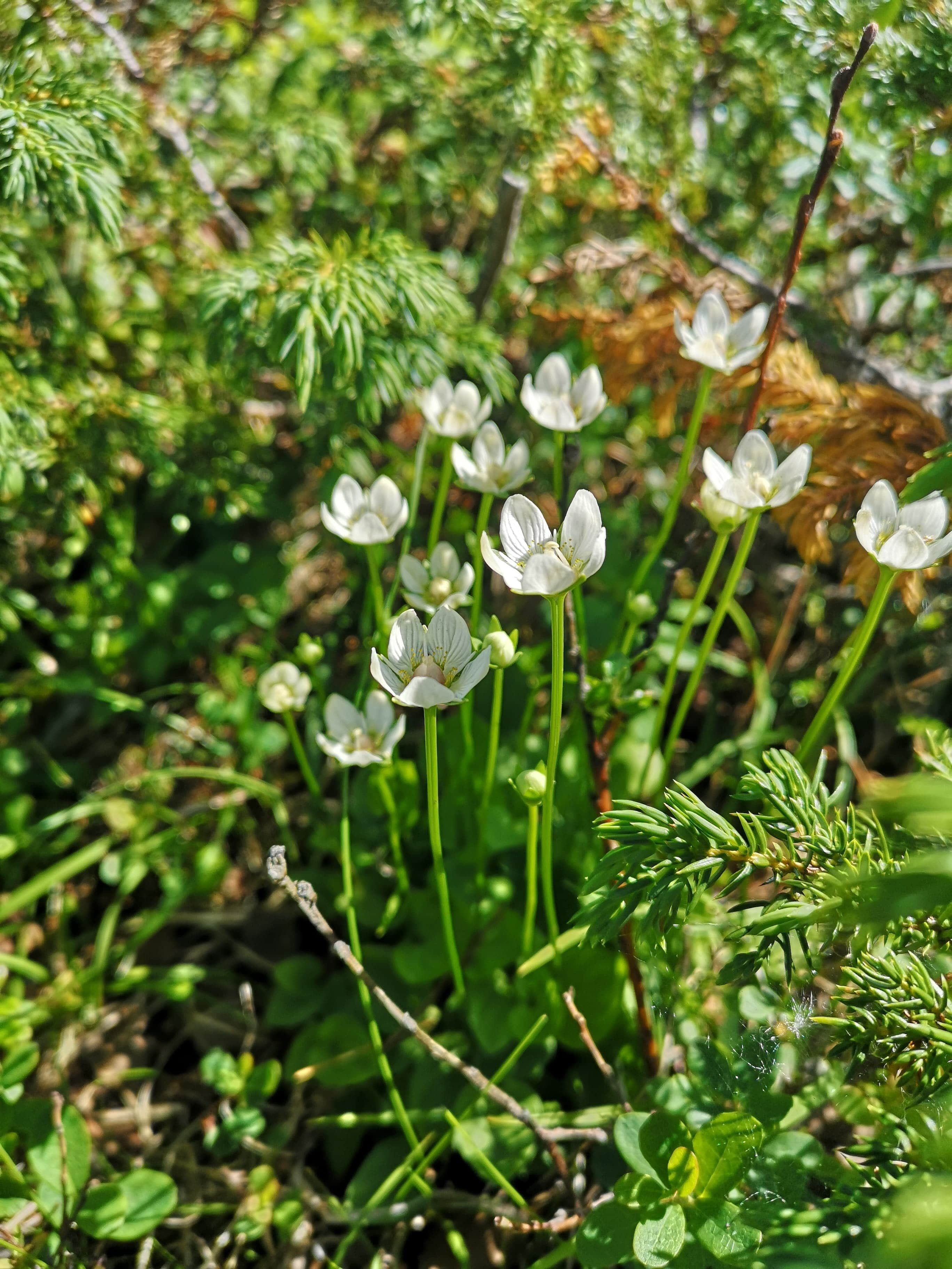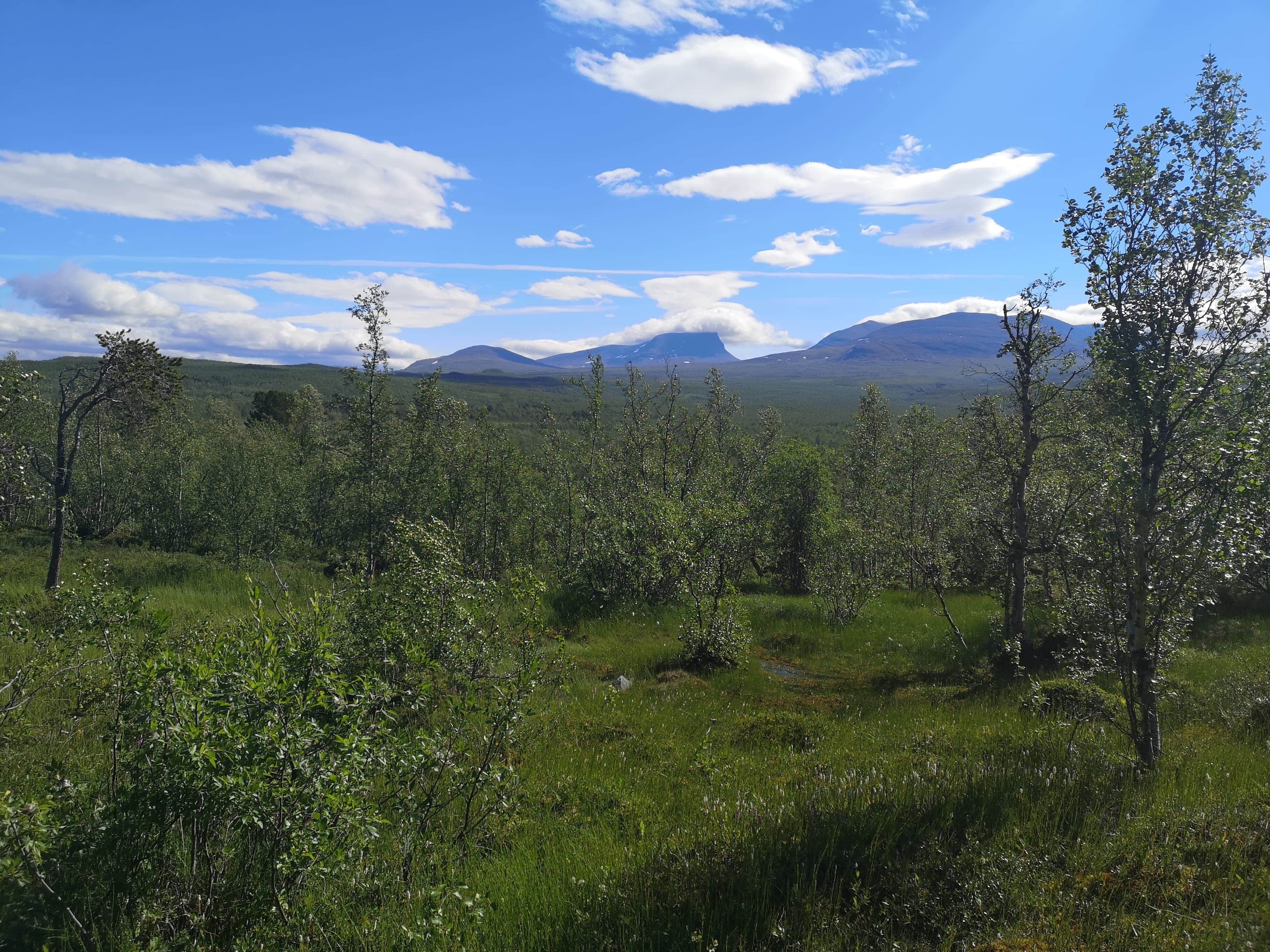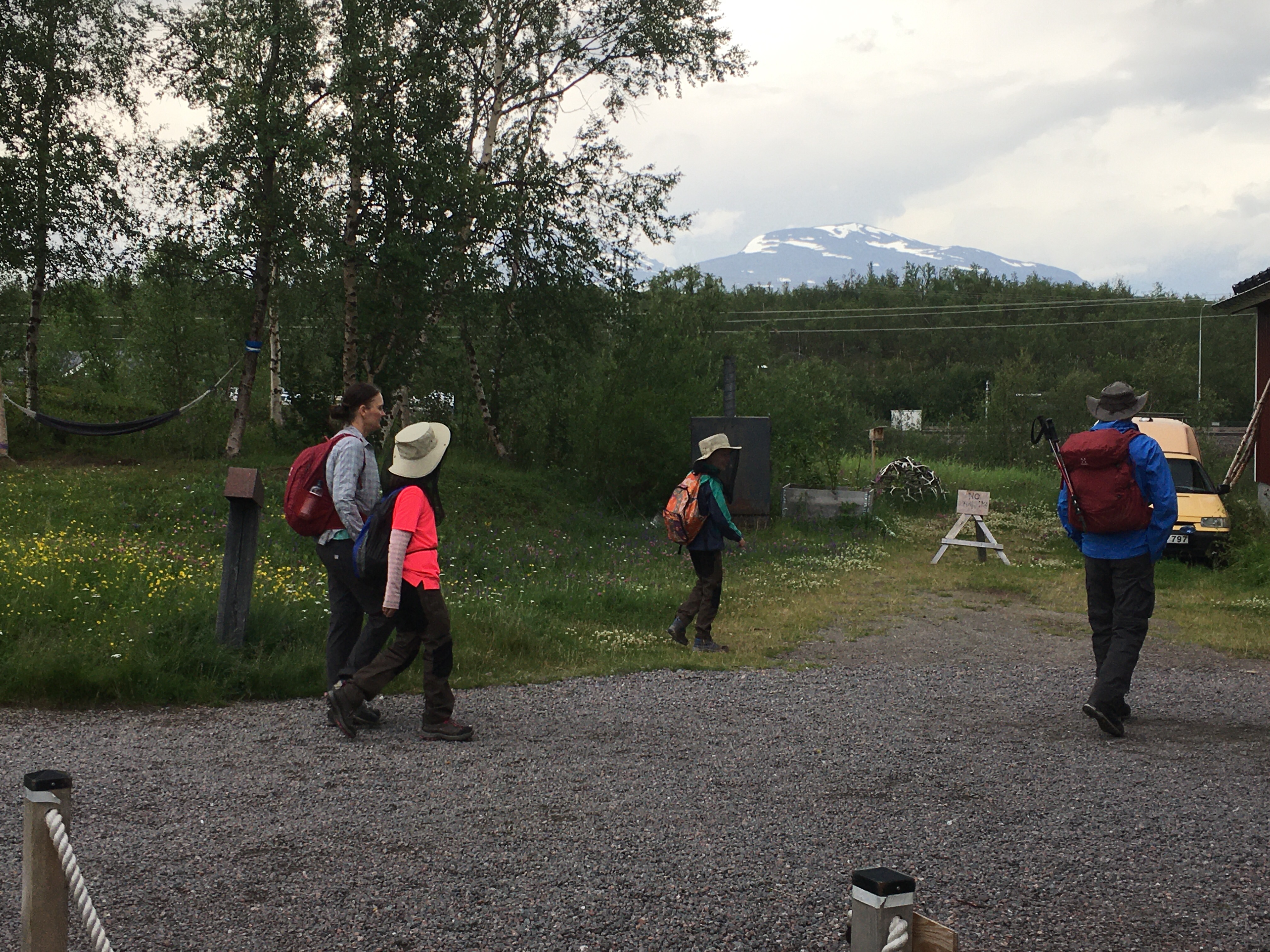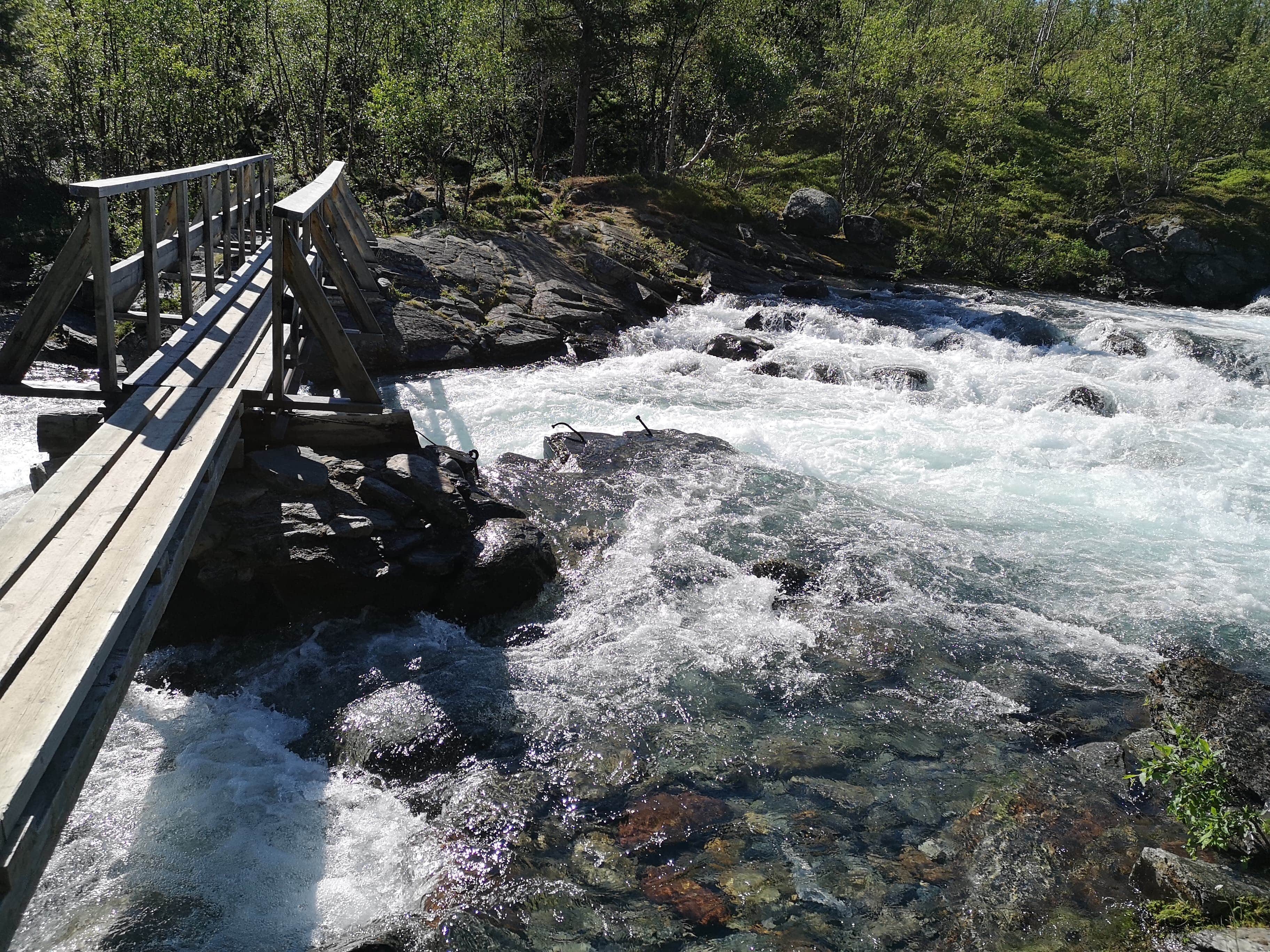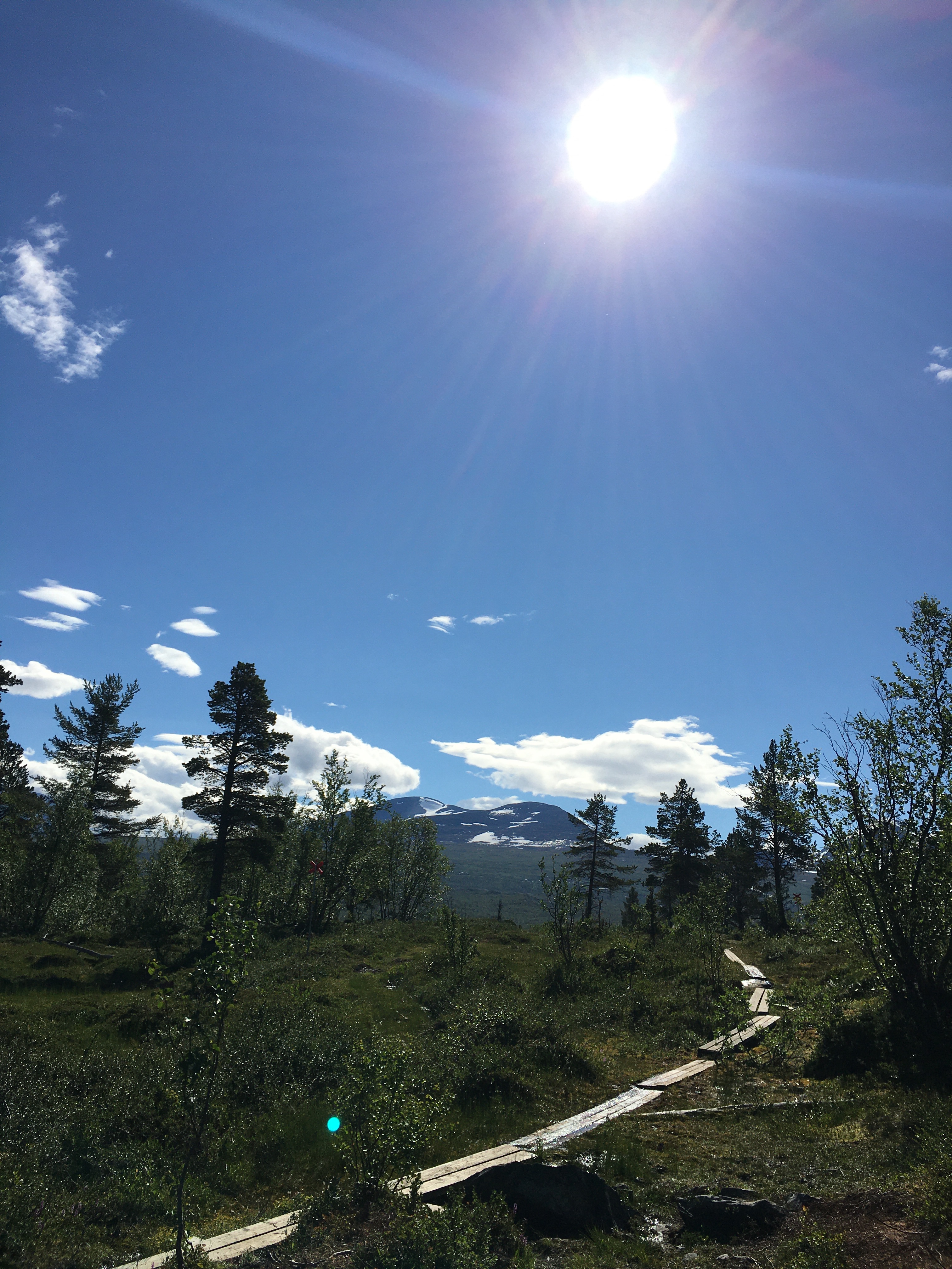 Mängder med blommor täcker marken den första sträckan som löper utmed älven. Smörboll, skogsstjärna, klöver och skogsnäva hör till de vanligare sorterna men så småningom syns andra arter som hönsbär, rödblära, gullbräcka och kanske till och med fjällsippa. Överallt fladdrar blåvingar omkring. Smala träspångar löper över vattenfyllda myrmarker som glittrar i solen med snötäckta fjäll vid horisonten. Tydligen har det regnat mycket de senaste veckorna, vilket visar sig genom att det stundtals är ren lera och sumpmark och ibland små bäckar man får ta sig över. Skorna blir blöta. Solen steker i nacken. Undertecknad tar av sig jackan och går i ärmlös topp vilket kommer visa sig vara en MYCKET DÅLIG IDÉ på kvällen.